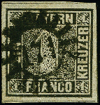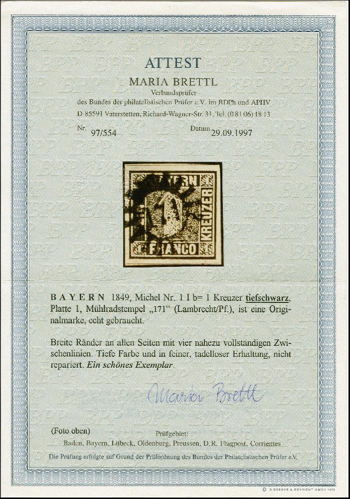 | Zusatzinformationen und Suchstichworte: | 383. Auktion Heinrich Köhler 14.–15. & 18.–23. März 2024 Los 3691 Altdeutschland Bayern 1 Kr. tiefschwarz, allseits breitrandig, allseitig mit Zwischenlinien, mit sauber aufgesetztem gMR "171" LAMBRECHT (Pfalz). Tadellos. Ein sehr schönes Stück der seltenen Farbe mit außerordentlich seltener Entwertung. Fotoattest Brettl BPP (1997) Ausruf 1.500,00 EUR |