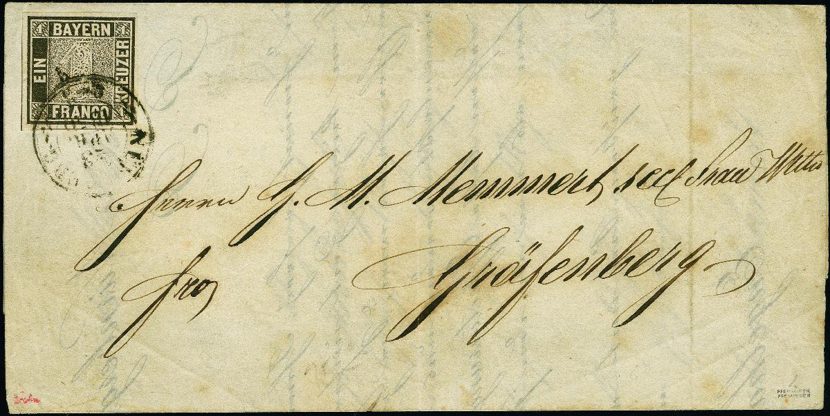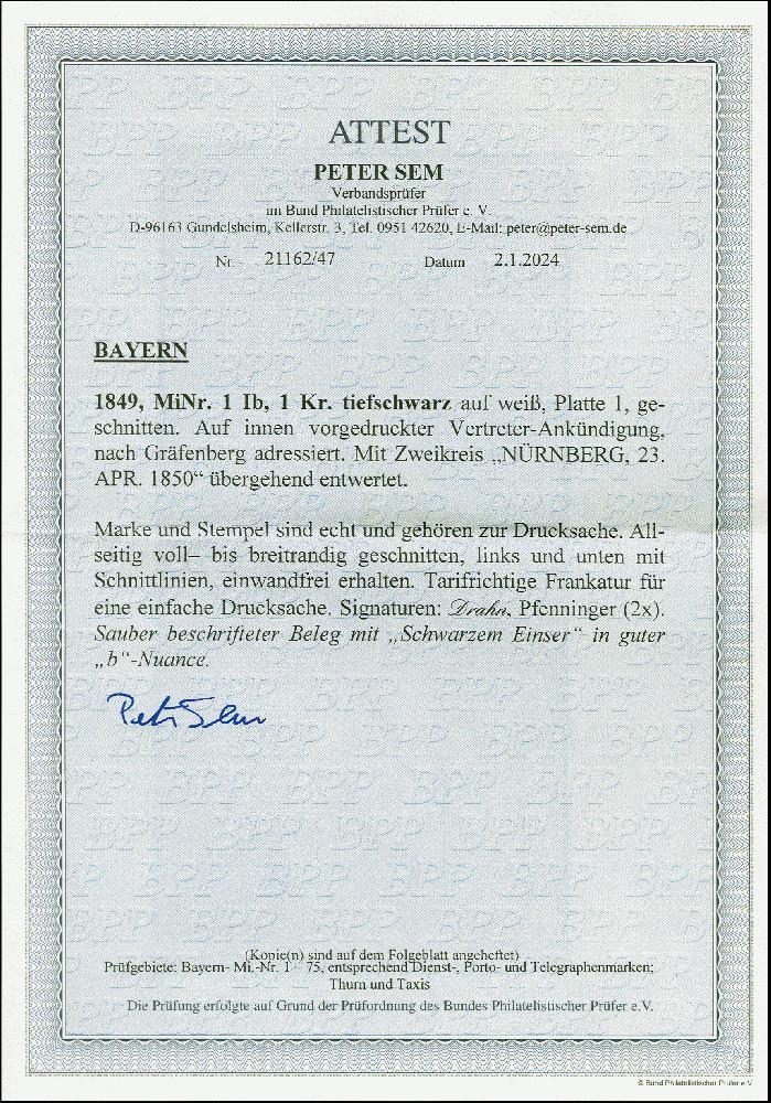 | Zusatzinformationen und Suchstichworte: | 383. Auktion Heinrich Köhler 14.–15. & 18.–23. März 2024 Los 3693 Altdeutschland Bayern 1 Kr. tiefschwarz, Platte 1, voll- bis breitrandig, mit Schnittlinien an 2 Seiten, mit DKr. "NÜRNBERG 23. APR.1850" auf kompletter Drucksache nach Gräfenberg (außerhalb der Frankatur leicht gefaltet) . Schöne und einwandfreie Erhaltung. Fotoatest Sem BPP (2024) Ausruf 2.500,00 EUR |