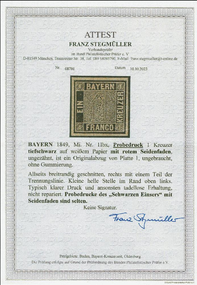 | Zusatzinformationen und Suchstichworte: | 383. Auktion Heinrich Köhler 14.–15. & 18.–23. März 2024 Los 3694 Altdeutschland Bayern 1 Kr., Probedruck in tiefschwarz mit rotem Seidenfaden, ungebraucht, farbfrisch und allseits breitrandig, oben links etwas randhell, sonst tadellose und frische Erhaltung. Fotoatteste Brettl BPP (1979) und Stegmüller BPP (2023 Ausruf 1.500,00 EUR |