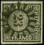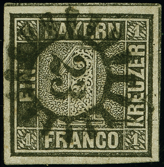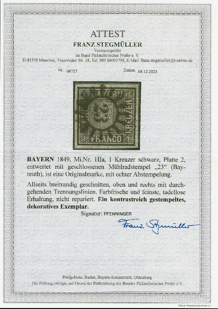 | Zusatzinformationen und Suchstichworte: | 383. Auktion Heinrich Köhler 14.–15. & 18.–23. März 2024 Los 3695 Altdeutschland Bayern 1 Kr. schwarz, Platte 2, farbfrisch und allseits breitrandig, mit klar und zentrisch aufgesetztem gMR "23" BAYREUTH. Tadellos. Signiert Pfenninger und Fotoattest Stegmüller BPP (2023) Fotoattest Stegmüller BPP (2023) Ausruf 1.000,00 EUR |
