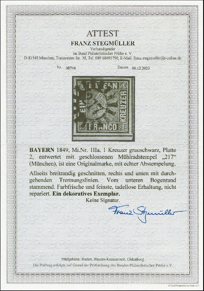 | Zusatzinformationen und Suchstichworte: | 383. Auktion Heinrich Köhler 14.–15. & 18.–23. März 2024 Los 3697 Altdeutschland Bayern 1 Kr. grauschwarz, Platte 2, farbfrisch und allseits breitrandig geschnitten, rechts und unten mit durchgehenden Trennungslinien, vom unteren Bogenrand stammend, sauber und klar mit geschlossenem Mühlradstempel "217" MÜNCHEN entwertet, ein tadelloses und besonders dekoratives Exemplar, Fotoattest Stegmüller BPP (2023) Ausruf 800,00 EUR |
