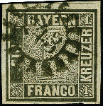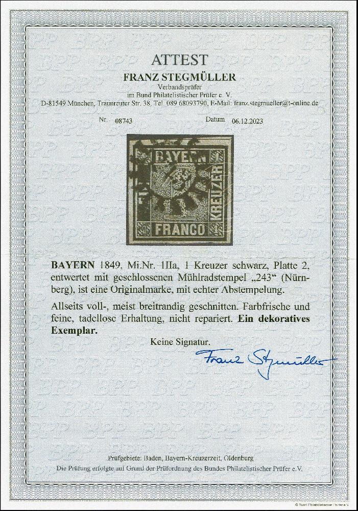 | Zusatzinformationen und Suchstichworte: | 383. Auktion Heinrich Köhler 14.–15. & 18.–23. März 2024 Los 3698 Altdeutschland Bayern 1 Kr. grauschwarz, Platte 2, farbfrisch und allseits voll- bis breitrandig geschnitten, sauber mit geschlossenem Mühlradstempel "243" NÜRNBERG entwertet, tadellos, Fotoattest Stegmüller BPP (2023) Ausruf 800,00 EUR |