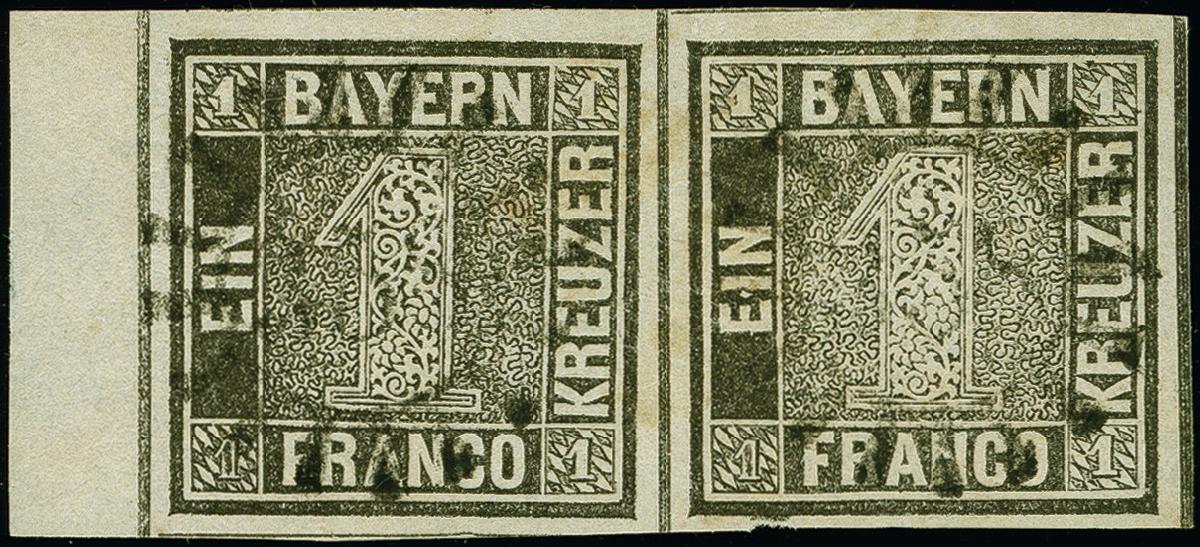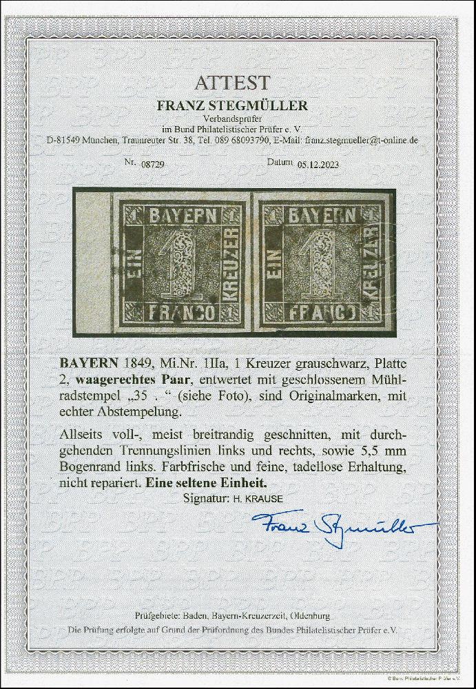 | Zusatzinformationen und Suchstichworte: | 383. Auktion Heinrich Köhler 14.–15. & 18.–23. März 2024 Los 3704 Altdeutschland Bayern 1 Kr. grauschwarz, Platte 2, waagerechtes Paar, farbfrisch und voll- bis meist breitrandig, links mit ca. 5,5 mm Bogenrand, leicht entwertet durch gMR "35…". Tadellos. Ein in dieser Form sehr seltenes Paar. Signiert H. Krause und Fotoattest Stegmüller BPP (2023) Ausruf 3.000,00 EUR |