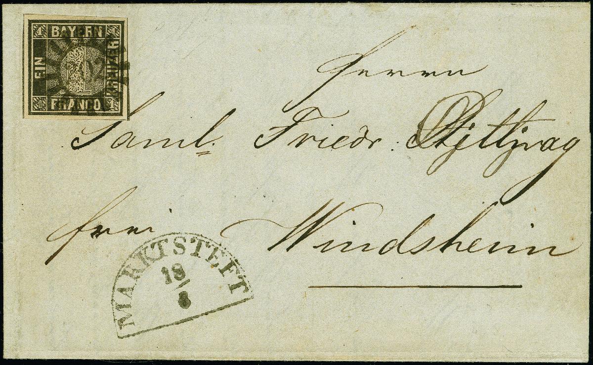 | Zusatzinformationen und Suchstichworte: | 383. Auktion Heinrich Köhler 14.–15. & 18.–23. März 2024 Los 3708 Altdeutschland Bayern 1 Kr. schwarz, Platte 2, breitrandig, mit zentrisch und klar aufgesetztem gMR "202"und nebengesetztem Halbkreis "MARKTSTEFT 18/6" auf kompletter Drucksache nach Windsheim. Der Name in der Adresse leicht abgeändert, sonst tadellos. Ein dekoratives Stück in einwandfreier Erhaltung. Signiert Schmitt BPP und Fotoattest Sem BPP (2024) Ausruf 2.000,00 EUR |