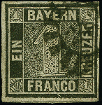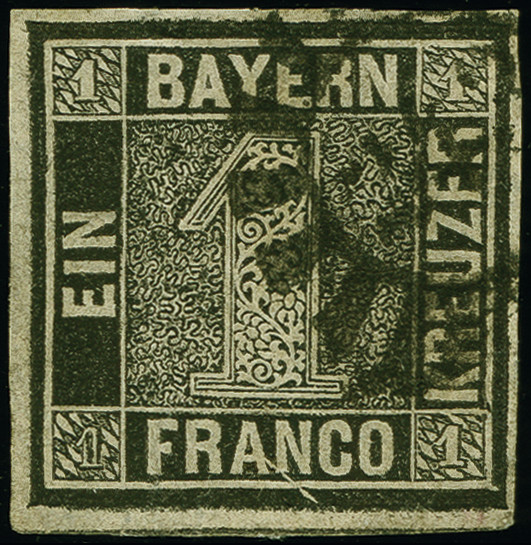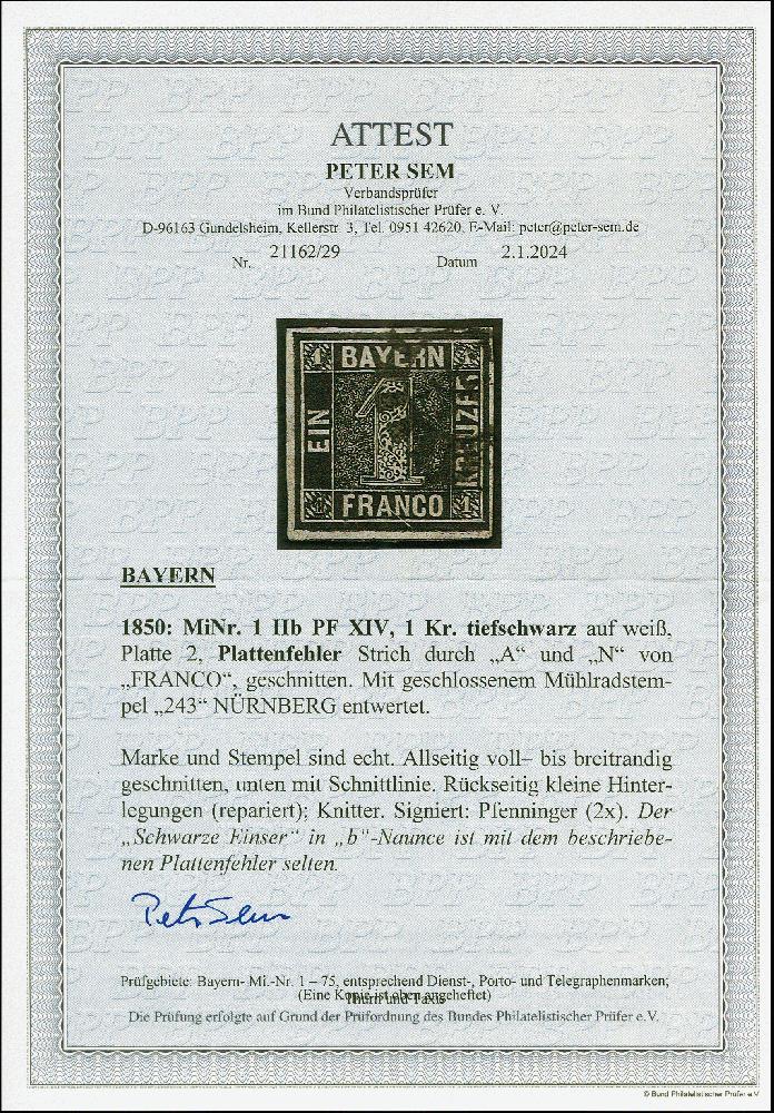 | Zusatzinformationen und Suchstichworte: | 383. Auktion Heinrich Köhler 14.–15. & 18.–23. März 2024 Los 3710 Altdeutschland Bayern 1 Kr. tiefschwarz, Platte 2, mit Plattenfehler "Strich durch AN", voll- bis breitrandig, entwertet durch gMR "243" NÜRNBERG. Kleine Hinterlegungen und Knitter, sonst einwandfrei. Fotoattest Sem BPP (2024) Ausruf 600,00 EUR |