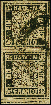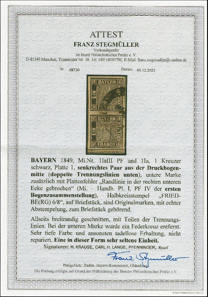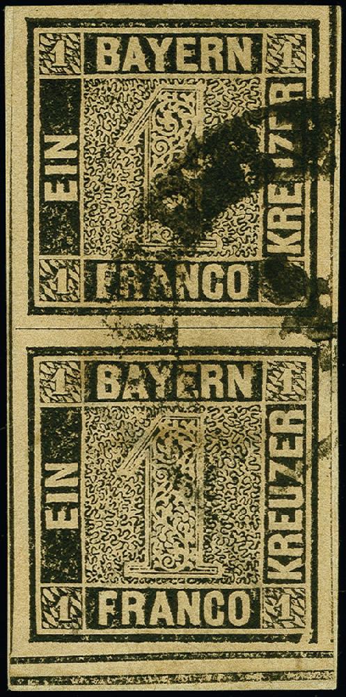 | Zusatzinformationen und Suchstichworte: | 383. Auktion Heinrich Köhler 14.–15. & 18.–23. März 2024 Los 3711 Altdeutschland Bayern 1 Kr. schwarz, Platte 1, senkrechtes Paar, unten mit vollständiger doppelter Trennungslinie (sogenannte 'Kleine Brücke'), die untere Marke zusätzlich mit Plattenfehler 'Randlinie in der rechten unteren Ecke gebrochen', farbtief und allseits breitrandig, mit Halbkreisstempel von Friedberg auf kurzgeschnittenen Briefstück. Die untere Marke mit abgeschwächtem Federkreuz, sonst tadellos. Eine in dieser Form sehr seltene Einheit. Signiert Pfenninger, H. Krause, Carl H Lange und Ressel, Fotoattest Stegmüller BPP (2023) Ausruf 4.000,00 EUR |