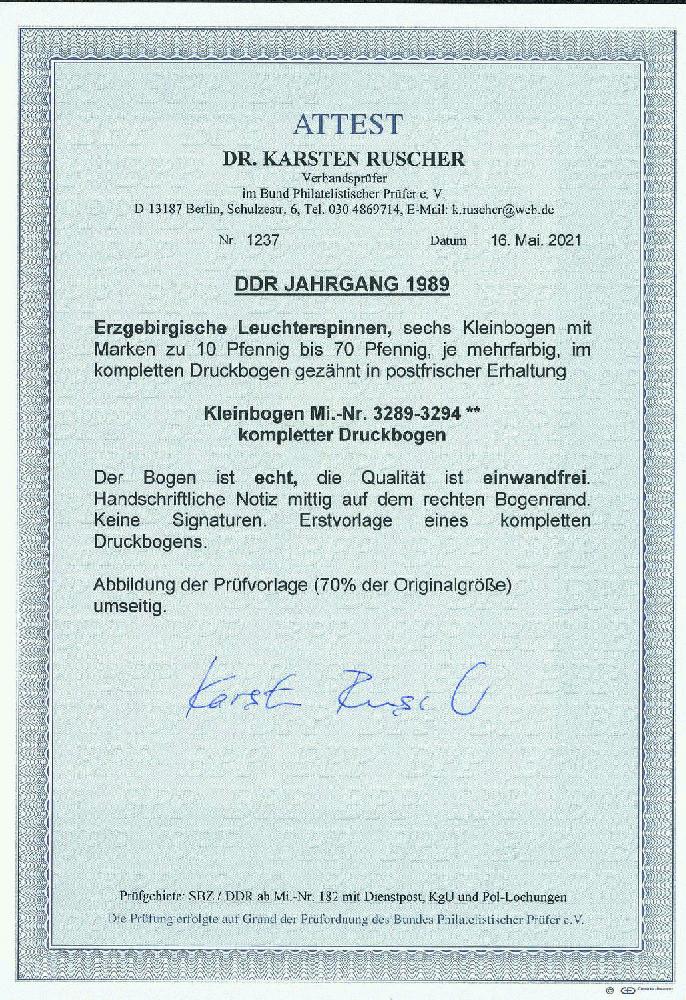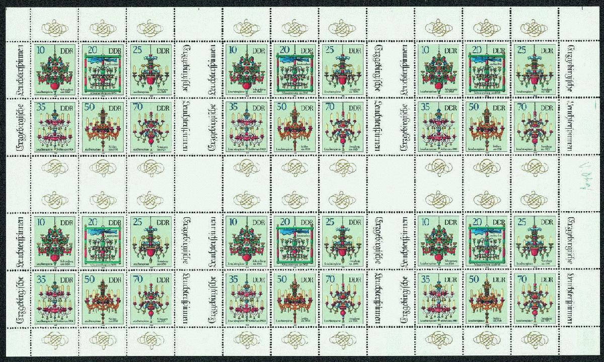 | Zusatzinformationen und Suchstichworte: | Erzgebirgische Leuchterspinnen, sechs Kleinbogen mit Marken zu 10 Pfennig bis 70 Pfennig, je mehrfarbig, im kompletten Druckbogen gezähnt und in postfrischer Erhaltung. |