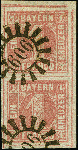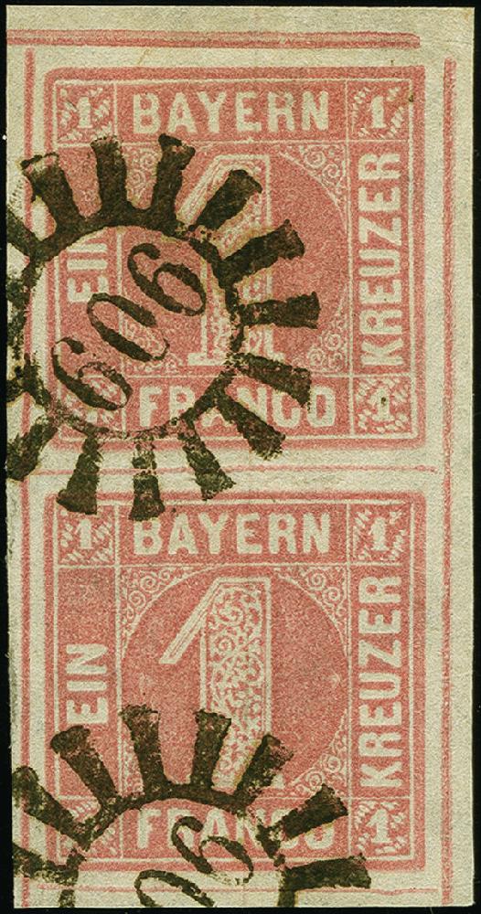 | Zusatzinformationen und Suchstichworte: | 383. Auktion Heinrich Köhler 14.–15. & 18.–23. März 2024 Los 3719 Altdeutschland Bayern 1 Kr. rosa im senkrechten Paar aus der rechten oberen Bogenecke, farbfrisch und allseits sehr breitrandig, mit vollständigen Zwischenlinien und schmalen Bogenrändern, sauber entwertet durch gMR "606". Tadellos. Fotobefund Sem BPP (2024) Ausruf 80,00 EUR |