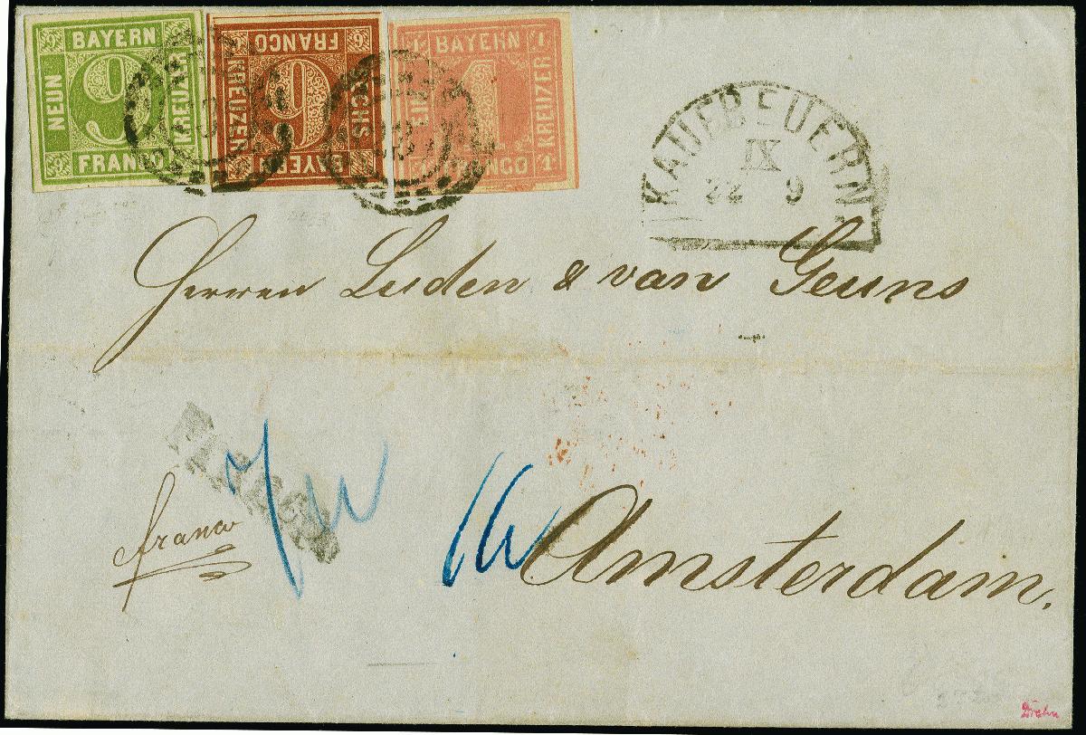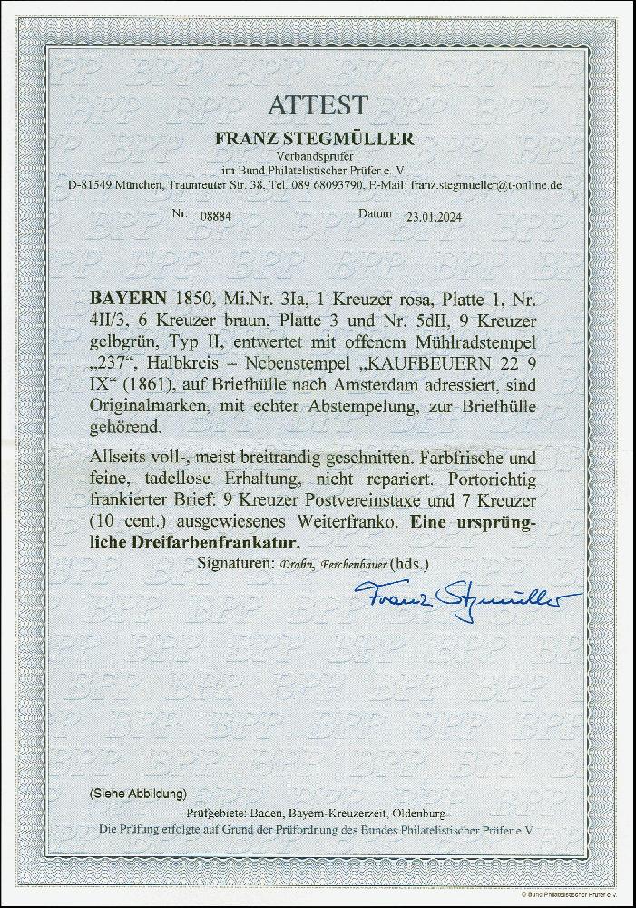 | Zusatzinformationen und Suchstichworte: | 383. Auktion Heinrich Köhler 14.–15. & 18.–23. März 2024 Los 3721 Altdeutschland Bayern 1 Kr. rosa, 6 Kr. braun und 9 Kr. gelbgrün, alle farbfrisch und voll- bis breitrandig, mit leicht aufgesetztem oMR "237" und nebengesetztem Halbkreisstempel "KAUFBEUREN 22 9" (1861) auf Briefhülle nach Amsterdam. Eine schöne Farbfrankatur in einwandfreier Erhaltung. Fotoattest Stegmüller BPP (2024) Ausruf 500,00 EUR |