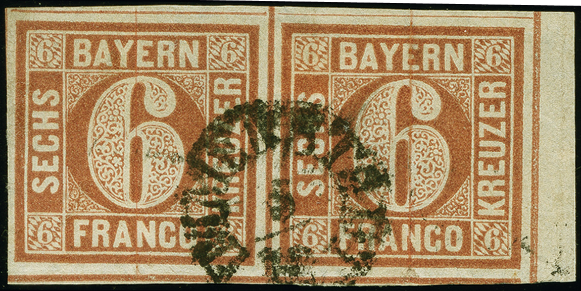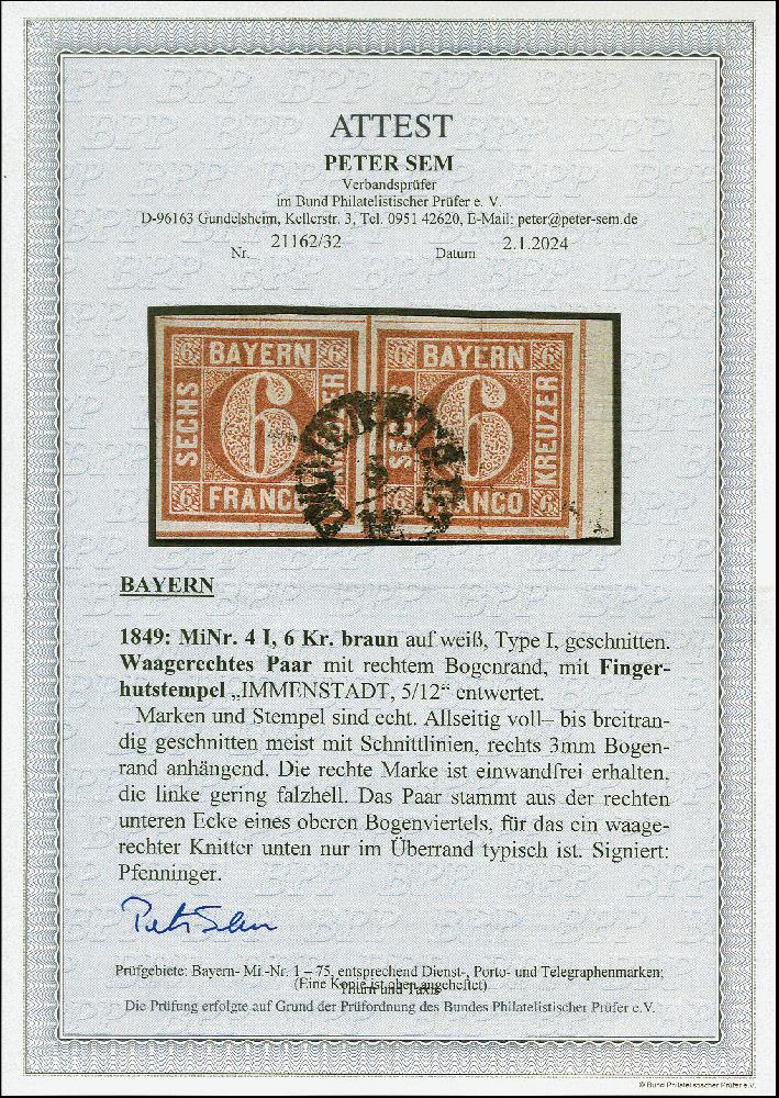 | Zusatzinformationen und Suchstichworte: | 383. Auktion Heinrich Köhler 14.–15. & 18.–23. März 2024 Los 3725 Altdeutschland Bayern 6 Kr. braunorange im waagerechten Paar, farbfrisch und breit- bis überrandig, rechts mit ca. 3 mm Bogenrand, mit Fingerhutstempel "IMMENSTADT 5/12". Die Linke Marke gering falzhell, sonst tadellos (im unteren Überrand geringe Knitterspur durch Bogenfaltung). Fotoattest Sem BPP (2024) Ausruf 300,00 EUR |