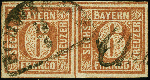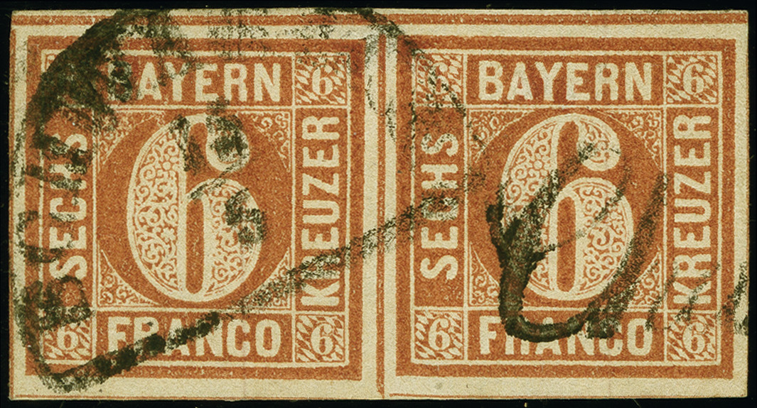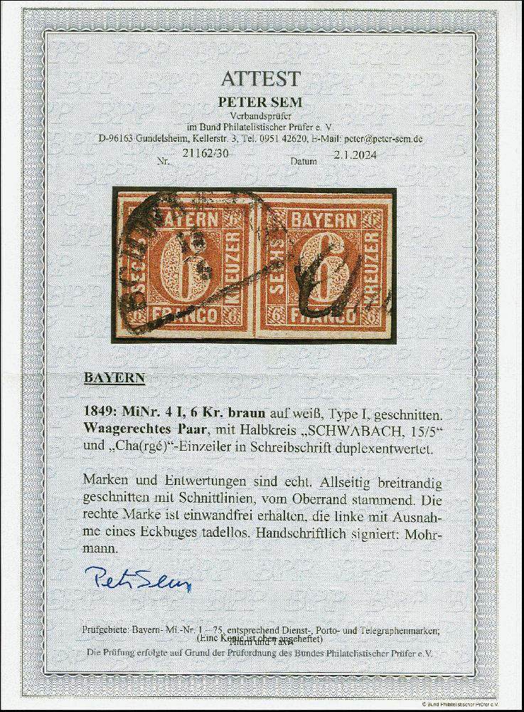 | Zusatzinformationen und Suchstichworte: | 383. Auktion Heinrich Köhler 14.–15. & 18.–23. März 2024 Los 3727 Altdeutschland Bayern 6 Kr. braunorange im waagerechten Paar, farbfrisch und allseits breitrandig, mit ’Duplex- Entwertung' durch Halbkreisstempel "SCHWABACH 15/5" und L1 "Char(ge)". Die Linke Marke oben kleiner Eckbug, sonst tadellos. Fotoattest Sem BPP (2024) Ausruf 300,00 EUR |