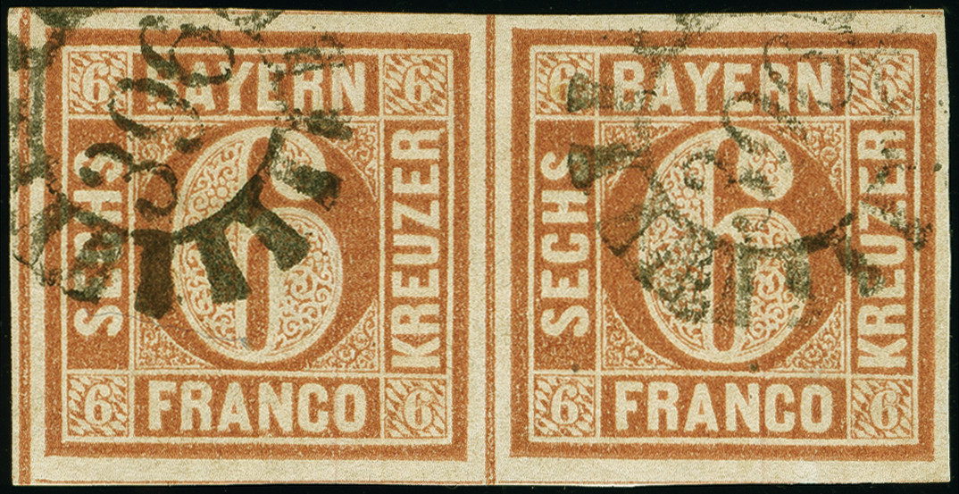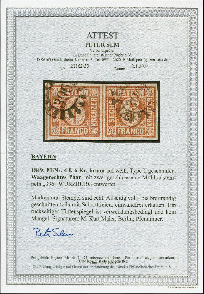 | Zusatzinformationen und Suchstichworte: | 383. Auktion Heinrich Köhler 14.–15. & 18.–23. März 2024 Los 3729 Altdeutschland Bayern 6 Kr. braunorange im waagerechten Paar, farbfrisch und voll- bis breitrandig, mit gMR "396" WÜRZBURG. Tadellos. Signiert Maier und Pfenninger, Fotoattest Sem BPP (2024) Ausruf 300,00 EUR |