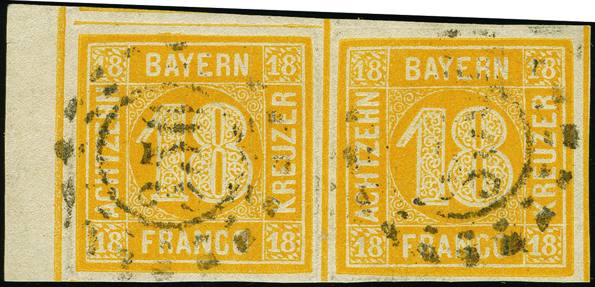 | Zusatzinformationen und Suchstichworte: | 383. Auktion Heinrich Köhler 14.–15. & 18.–23. März 2024 Los 3736 Altdeutschland Bayern 18 Kr. gelborange im waagerechten Paar, farbfrisch und voll- bis überrandig, links mit ca. 4mm Bogenrand, leicht entwertet durch oMR "356" NÜRNBERG. Tadellos. Ein Ausnahmestück. signiert Pfenninger, Fotoattest Sem BPP (2024) Ausruf 300,00 EUR |