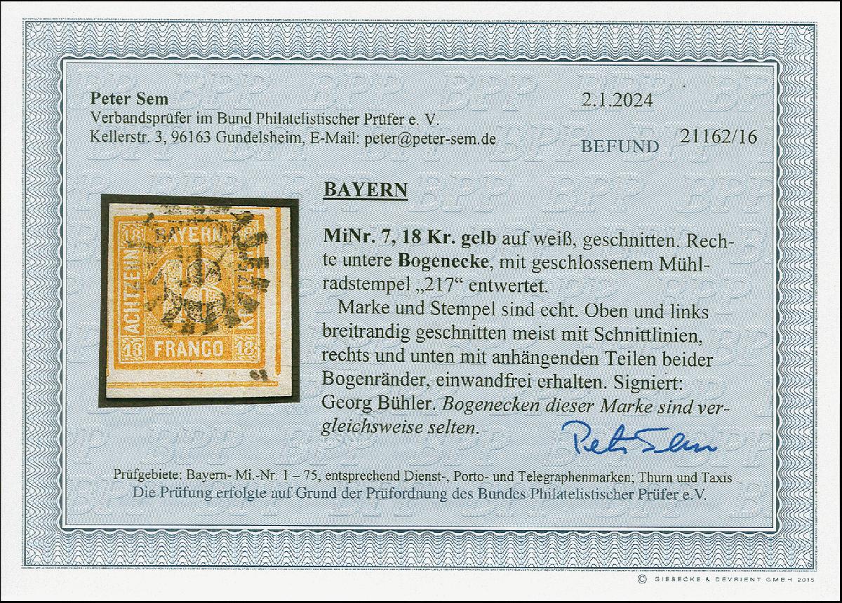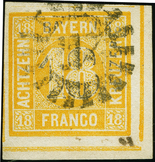 | Zusatzinformationen und Suchstichworte: | 383. Auktion Heinrich Köhler 14.–15. & 18.–23. März 2024 Los 3738 Altdeutschland Bayern 18 Kr. gelborange, farbfrische und allseits breitrandige rechte untere Bogenecke mit fast vollen Zwischenlinien und schmalen Bogenrändern, entwertet mit gMR “217”, tadellos. Signiert Georg Bühler und Fotobefund Sem BPP (2024) Ausruf 100,00 EUR |