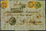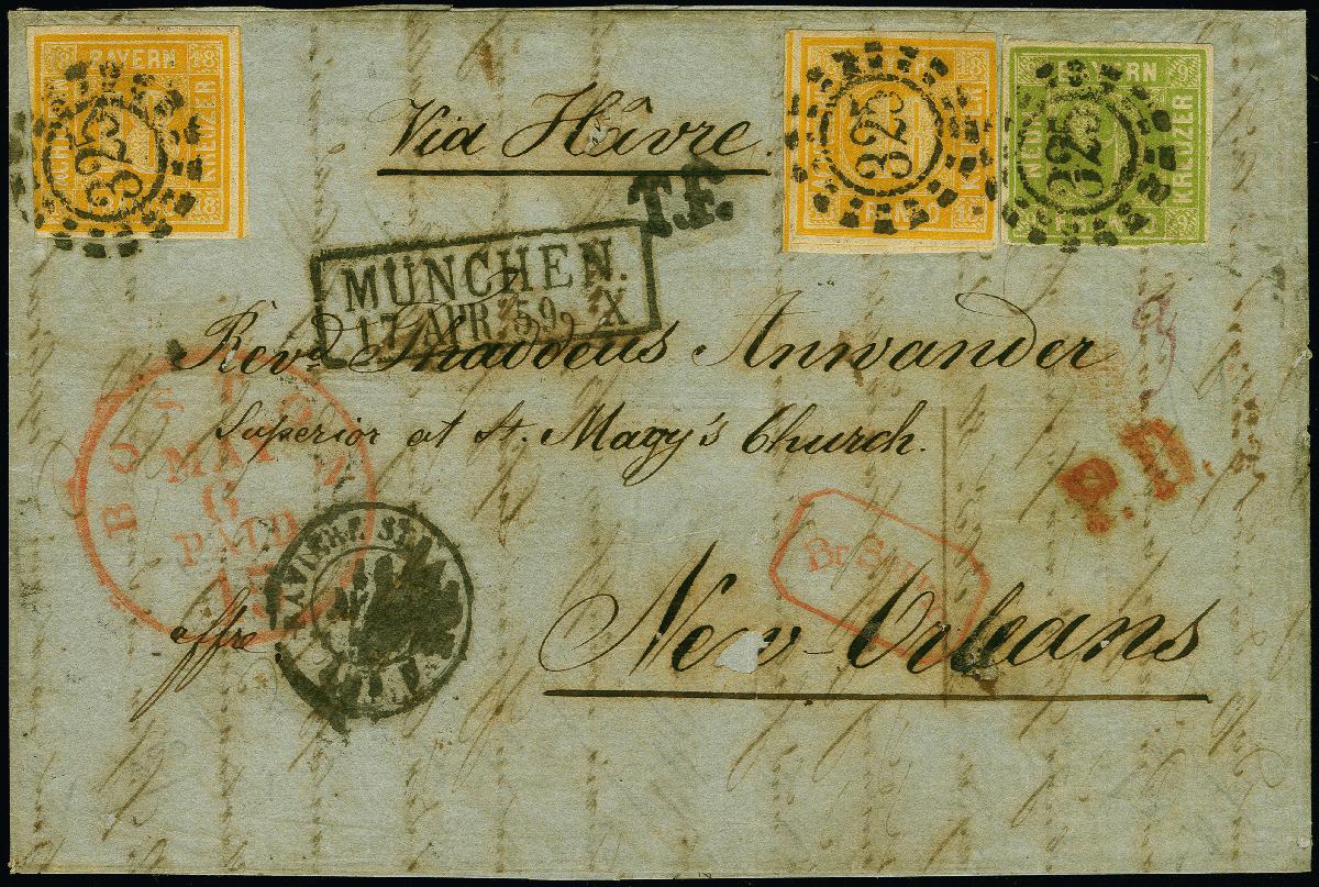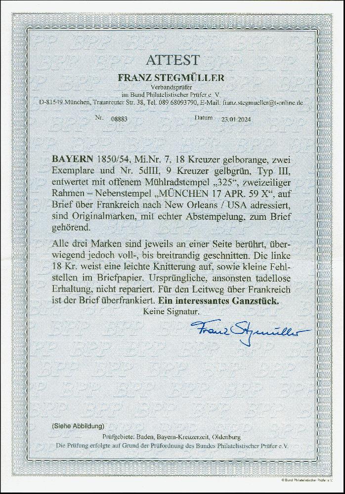 | Zusatzinformationen und Suchstichworte: | 383. Auktion Heinrich Köhler 14.–15. & 18.–23. März 2024 Los 3741 Altdeutschland Bayern 18 Kr. gelborange, 2 Einzelwerte, zusammen mit 9 Kr. gelbgrün, alle farbfrisch, jeweils etwas berührt, sonst voll- bis breitrandig, mit oMR "325" und sauber nebengesetztem Ra2 "MÜNCHEN 17 APR. 59" auf komplettem Faltbrief über Frankreich nach New Orleans. Für diesen Leitweg überfrankiert; die Frankatur entspricht einem Transport über die 'Prussian closed mail'. Der links klebende Wert leichte Knitterung und kleine Fehlstelle im Briefpapier, sonst tadellos. Ein attraktiver Transatlantik-Brief. Fotoattest Stegmüller BPP (2024) Ausruf 1.000,00 EUR |
