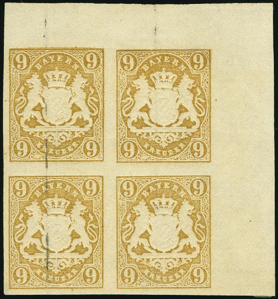 | Zusatzinformationen und Suchstichworte: | 383. Auktion Heinrich Köhler 14.–15. & 18.–23. März 2024 Los 3755 Altdeutschland Bayern 9 Kr. ocker im 4er-Block aus der rechten oberen Bogenecke mit ca. 8/11 mm Bogenrändern, ungebraucht, einwandfrei, Kurzbefund Sem BPP Ausruf 160,00 EUR |
