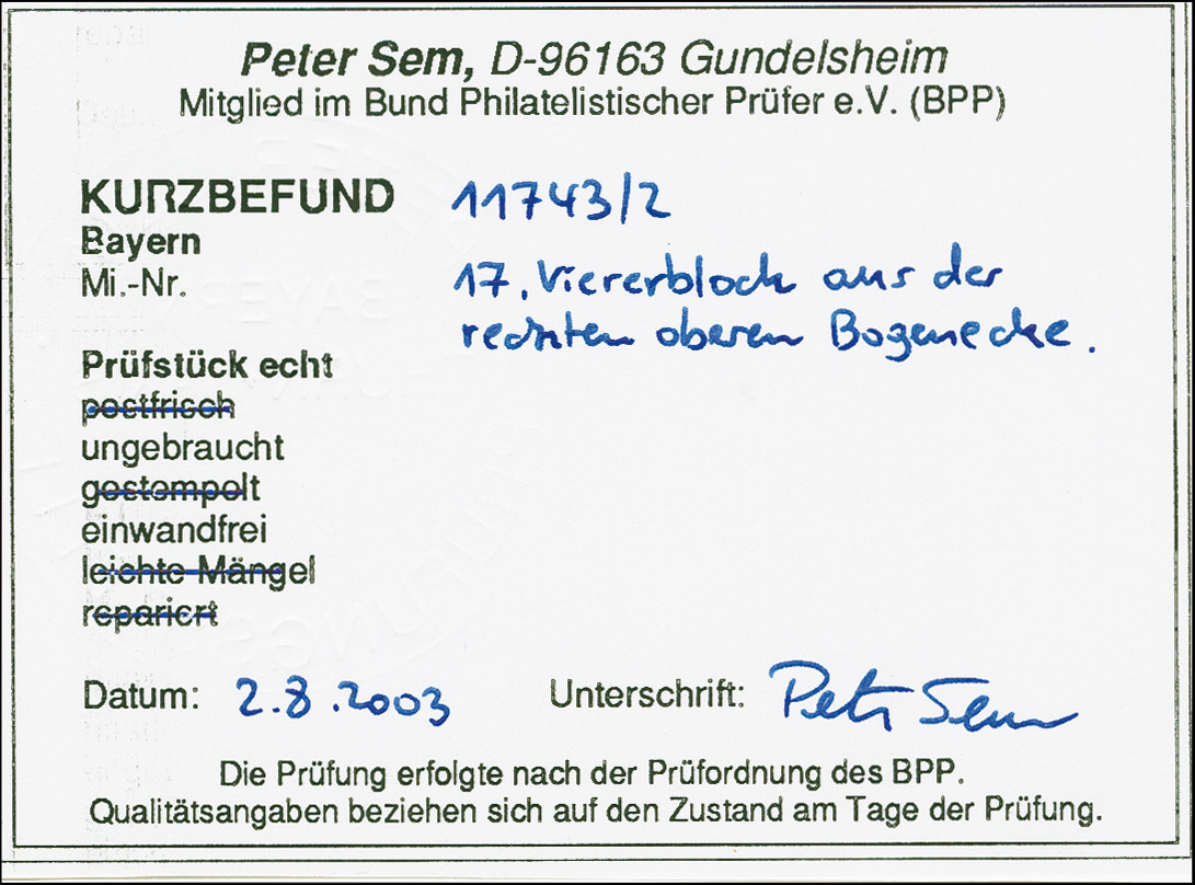 | Prüfer: | Sem, Peter (BPP (Bund Philatelistischer Prüfer)) |