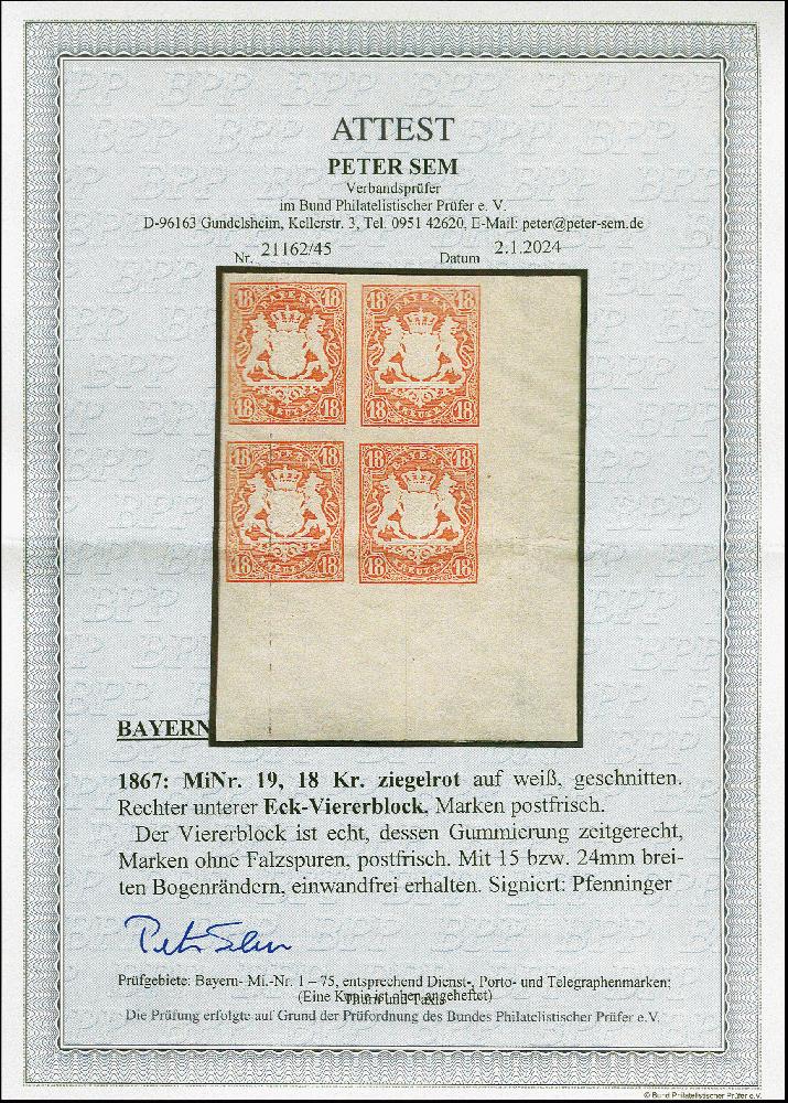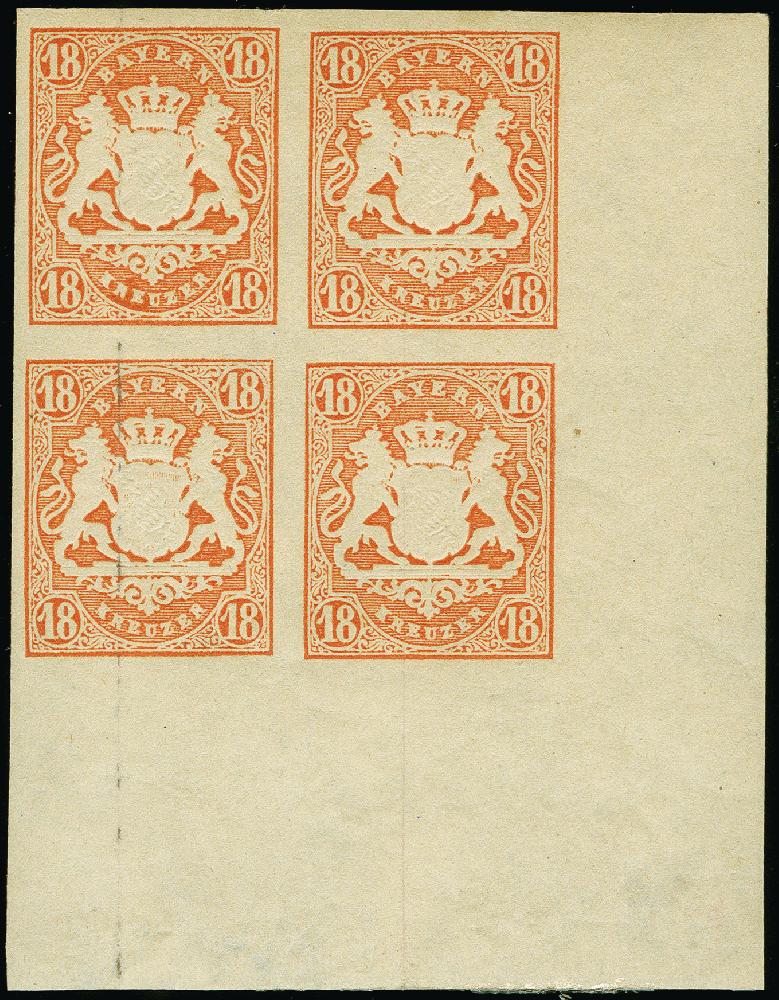 | Zusatzinformationen und Suchstichworte: | 383. Auktion Heinrich Köhler 14.–15. & 18.–23. März 2024 Los 3756 Altdeutschland Bayern 18 Kr. zinnoberrot Im Viererblock aus der rechten unteren Bogenecke, farbfrisch und breitrandig mit 15/24 mm Bogenrand, postfrisch, in tadelloser Erhaltung. Signiert Pfenninger und Fotoattest Sem BPP (2024) Ausruf 300,00 EUR |