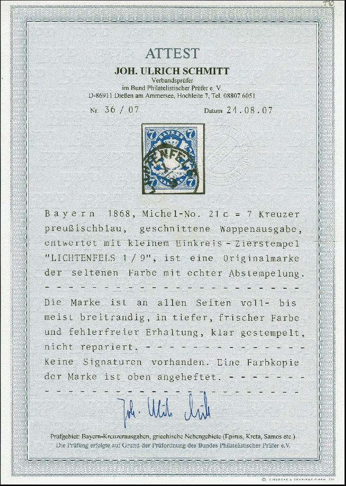 | Zusatzinformationen und Suchstichworte: | 383. Auktion Heinrich Köhler 14.–15. & 18.–23. März 2024 Los 3762 Altdeutschland Bayern 7 Kr. preußischblau, farbfrisch und allseits voll- bis meist breitrandig, mit klarem EKr. "LICHTENFELS 1/9" entwertet, tadellos, Fotoattest Schmitt BPP (2007) Ausruf 200,00 EUR |