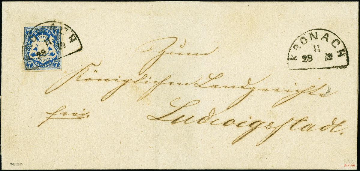 | Zusatzinformationen und Suchstichworte: | 383. Auktion Heinrich Köhler 14.–15. & 18.–23. März 2024 Los 3766 Altdeutschland Bayern 7 Kr. preußischblau, voll- bis meist breitrandig und sehr schön farbfrisch, mit klar auf- und nebengesetztem Halbkreis "KRONACH 28 12" auf Briefhülle der 2.Gewichtsstufe, nach Ludwigsstadt. Sehr schöne und tadellose Erhaltung. Fotoattest Sem BPP (2024) Ausruf 600,00 EUR |