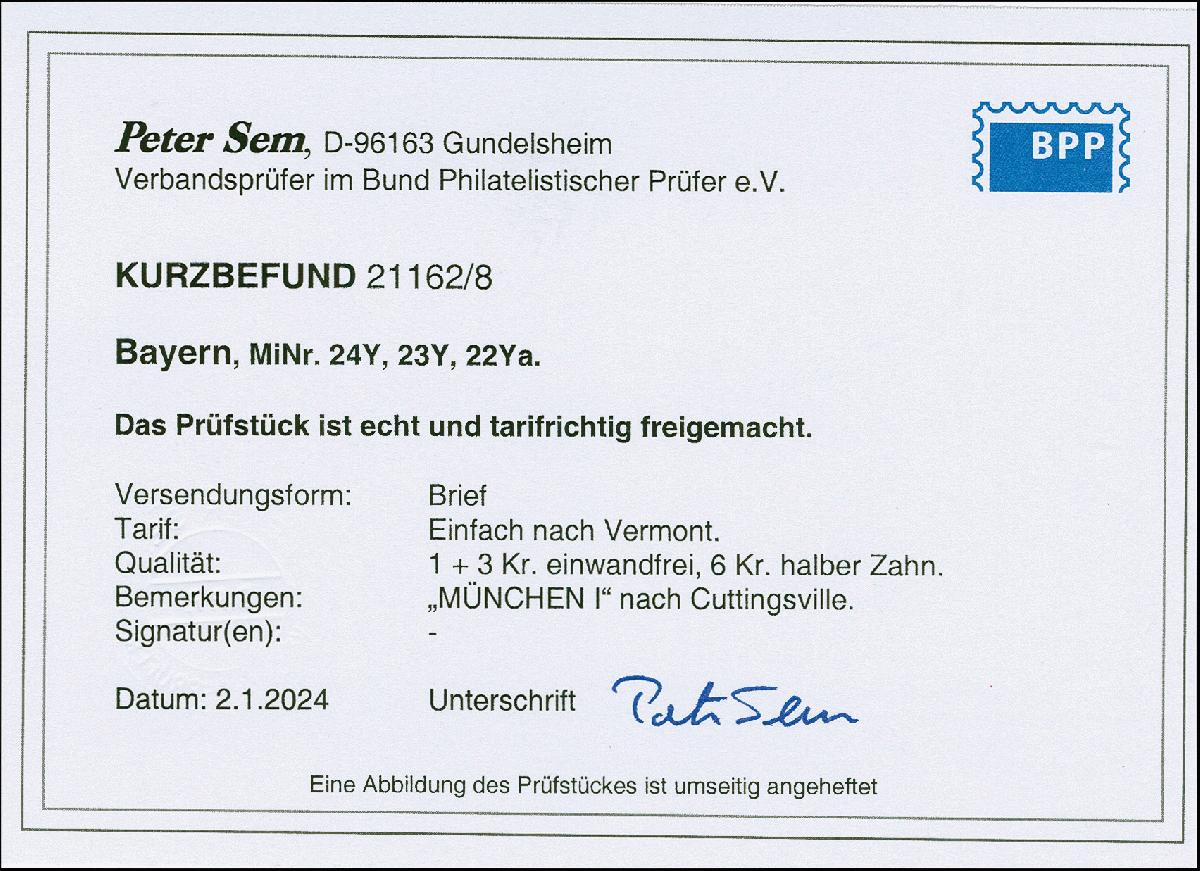 | Zusatzinformationen und Suchstichworte: | 383. Auktion Heinrich Köhler 14.–15. & 18.–23. März 2024 Los 3768 Altdeutschland Bayern 1 Kr. gelbgrün, 3 Kr. rosa und 6 Kr. braun, alle farbfrisch und bis auf einen verkürzten Zahn bei der 6 Kr. gut gezähnt, mit EKr. "MÜNCHEN 27 APR." auf Briefkuvert mit Leitvermerk "Hamburg" nach Vermont, USA. Frische und sonst einwandfreie Erhaltung. Kurzbefund Sem BPP Ausruf 150,00 EUR |
