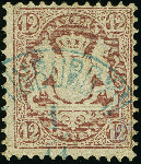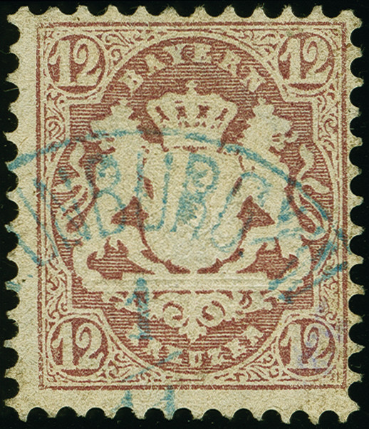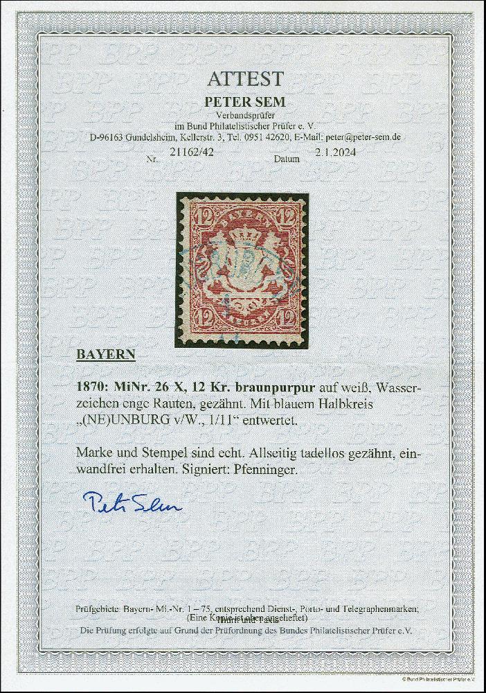 | Zusatzinformationen und Suchstichworte: | 383. Auktion Heinrich Köhler 14.–15. & 18.–23. März 2024 Los 3769 Altdeutschland Bayern 12 Kr. braunpurpur, farbfrisch und tadellos gezähnt, sauber entwertet durch blauen Halbkreisstempel von Neunburg. Tadellos. Signiert Pfenninger, Fotoattest Sem BPP (2024) Ausruf 300,00 EUR |