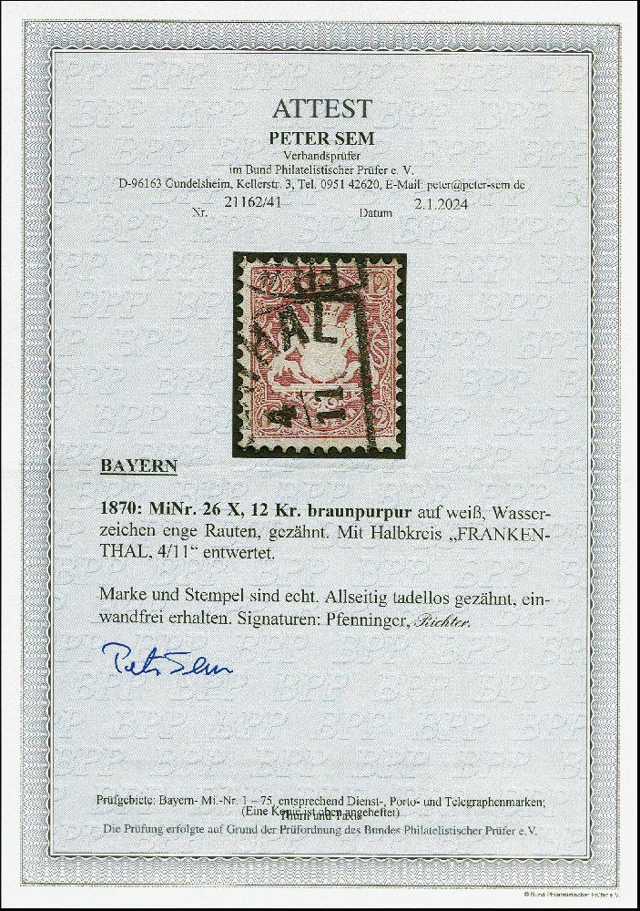 | Zusatzinformationen und Suchstichworte: | 383. Auktion Heinrich Köhler 14.–15. & 18.–23. März 2024 Los 3770 Altdeutschland Bayern 12 Kr. braunpurpur, farbfrisch und tadellos gezähnt, sauber entwertet durch Halbkreisstempel von Frankenthal. Tadellos. Signiert Pfenninger und Richter, Fotoattest Sem BPP (2024) Ausruf 300,00 EUR |
