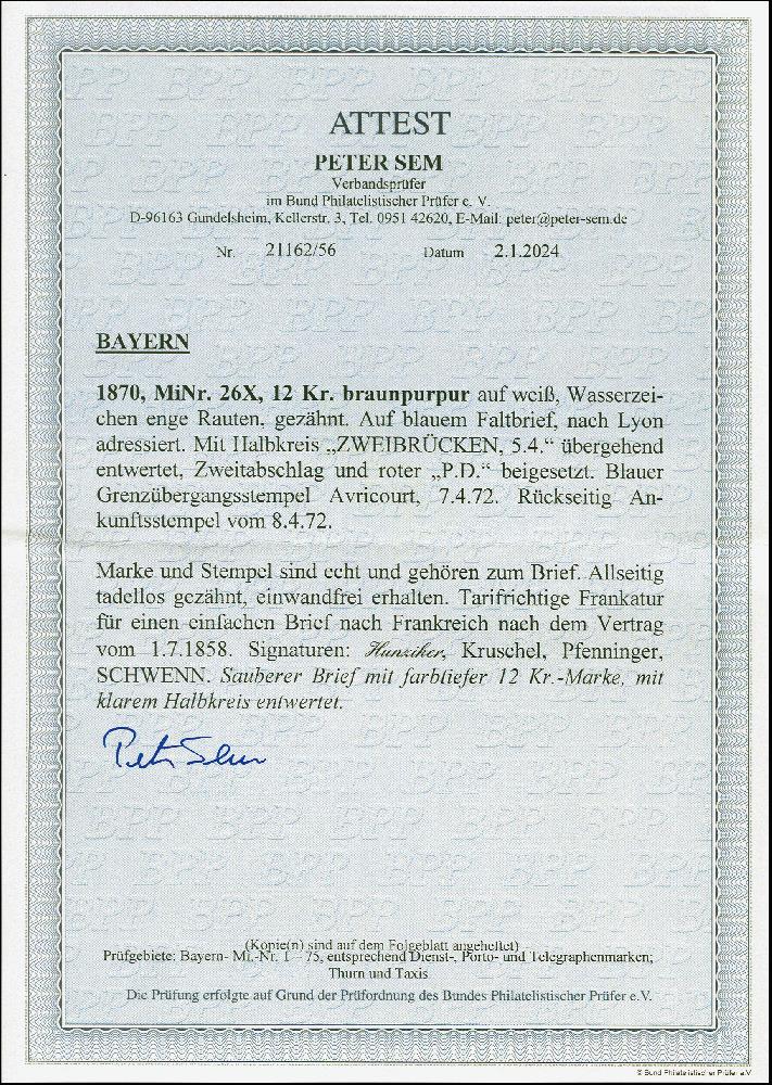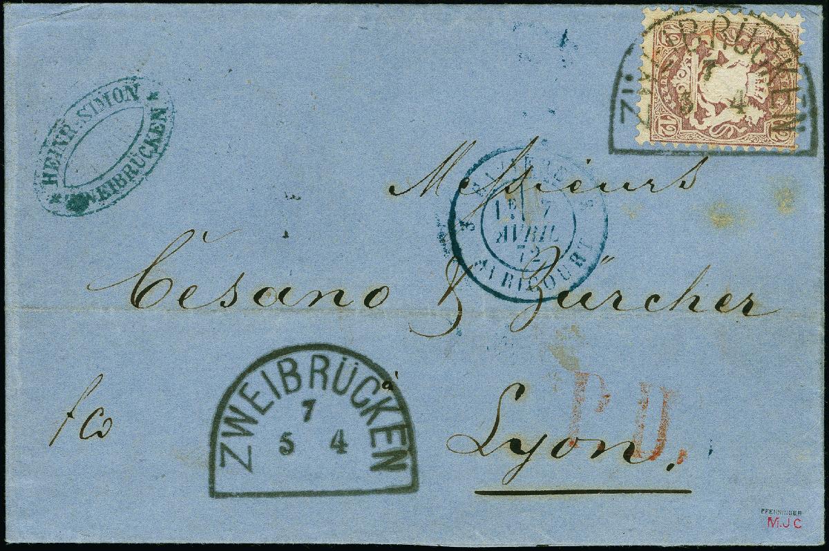 | Zusatzinformationen und Suchstichworte: | 383. Auktion Heinrich Köhler 14.–15. & 18.–23. März 2024 Los 3772 Altdeutschland Bayern 12 Kr. lila, farbfrisch und tadellos gezähnt mit klar auf- und nebengesetztem Halbkreis "ZWEIBRÜCKEN 5 4" (1872) auf komplettem blauem Faltbrief nach Lyon, mit nebengesetztem blauen Transitstempel. Eine sehr attraktive Einzelfrankatur in tadelloser Erhaltung. Signiert Schwenn, Hunziker, Kruschel und Pfenninger, Fotoattest Sem BPP (2024) Ausruf 1.500,00 EUR |
