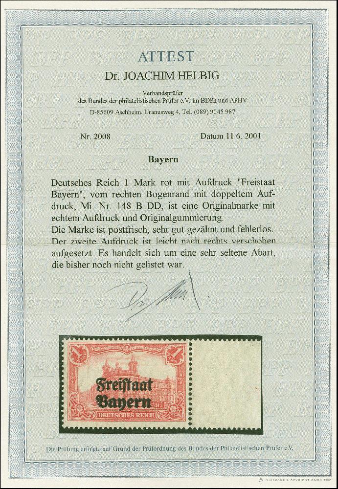 | Zusatzinformationen und Suchstichworte: | 383. Auktion Heinrich Köhler 14.–15. & 18.–23. März 2024 Los 3779 Altdeutschland Bayern Germania Freistaat 1 M. mit doppeltem Aufdruck, rechtes Randstück, postfrisch, tadellos. Unsigniert, Fotoattest Dr. Helbig BPP (2001) Ausruf 500,00 EUR |