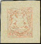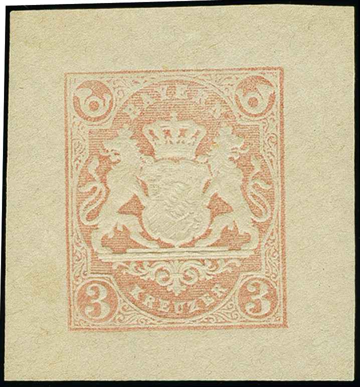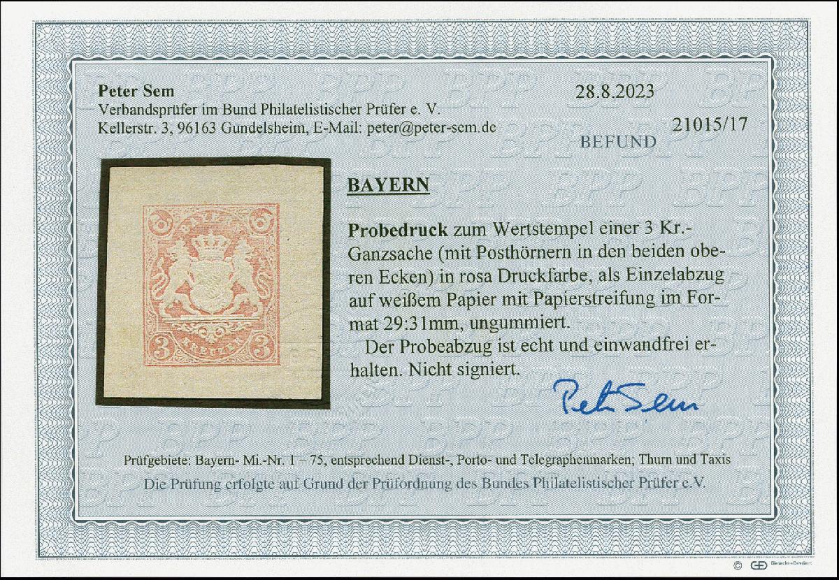 | Zusatzinformationen und Suchstichworte: | 383. Auktion Heinrich Köhler 14.–15. & 18.–23. März 2024 Los 3790 Altdeutschland Bayern 1869, Probedruck 3 Kr. rosa mit Posthörnern in den oberen Ecken, Einzelabzug auf weißem, gestreiftem Papier. Fotobefund Sem BPP (2023) Ausruf 100,00 EUR |