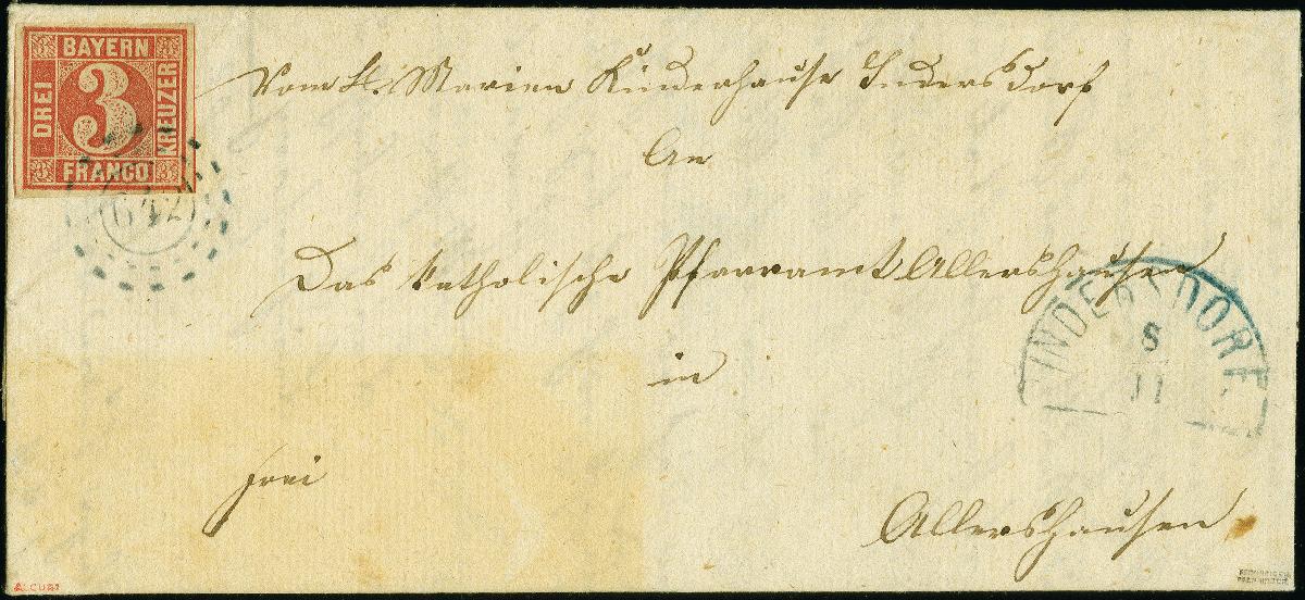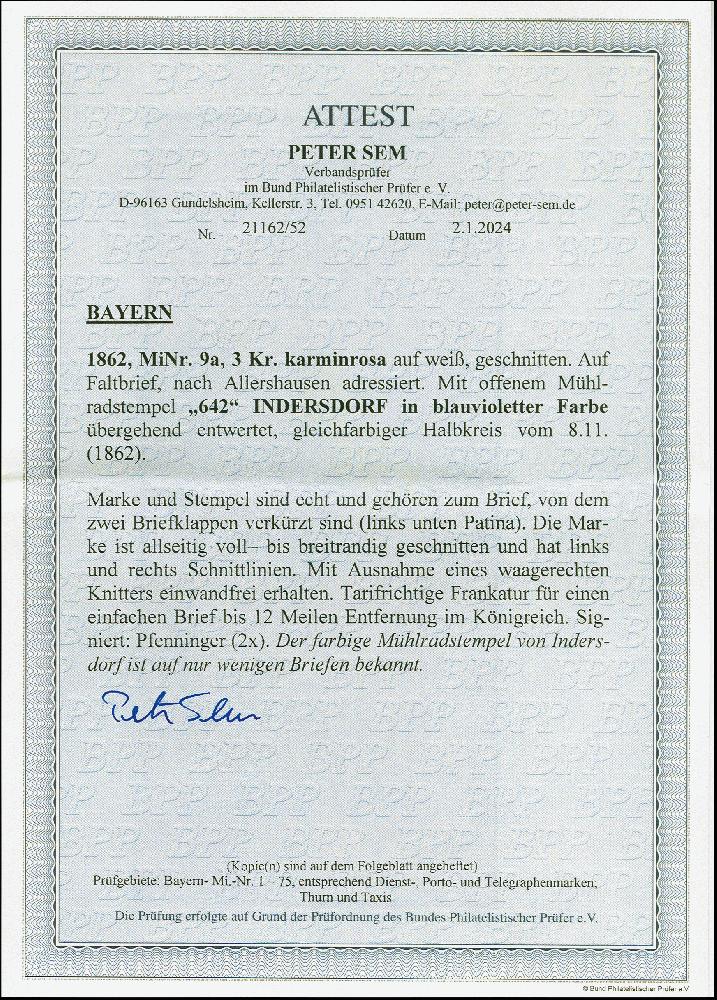 | Zusatzinformationen und Suchstichworte: | 383. Auktion Heinrich Köhler 14.–15. & 18.–23. März 2024 Los 3795 Altdeutschland Bayern "642" in blau, glasklar auf 3 Kreuzer rosa, voll- bis breitrandig, mit sauber nebengesetztem blauem Halbkreis "INDERSDORF 8/11" (1862) auf Faltbrief (2 Briefklappen verkürzt) nach Allershausen. Die Frankatur ist bis auf einen waagerechten Knitter einwandfrei, die Hülle links unten durch alten Aufkleber etwas verfärbt. Ein seltener Brief. Fotoattest Sem BPP (2024) Ausruf 800,00 EUR |