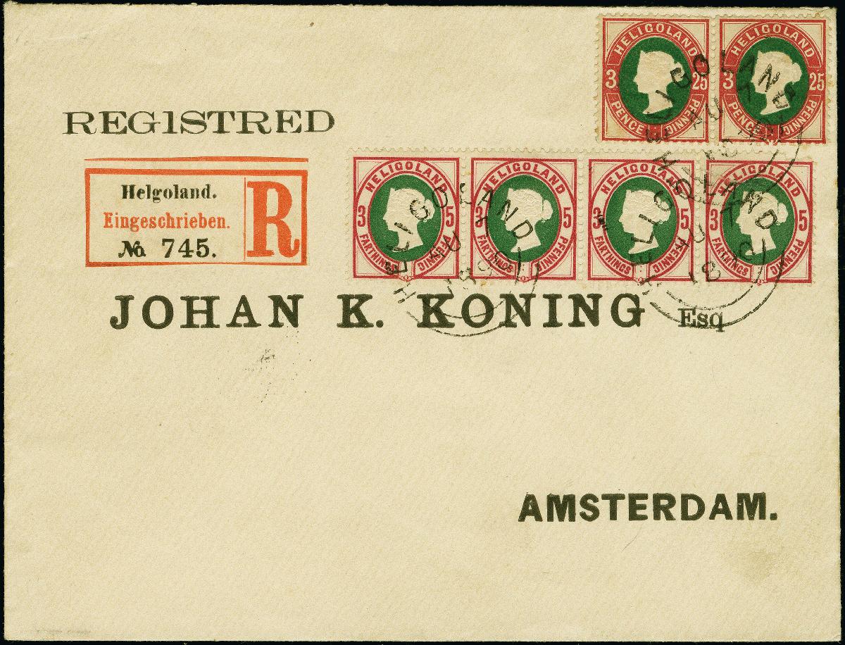 | Zusatzinformationen und Suchstichworte: | 383. Auktion Heinrich Köhler Auktionstermin 14.–15. & 18.–23. März 2024 Los 3884 Altdeutschland Helgoland 5 Pfg. lebhaftlilakarmin/grün im waagerechten Viererstreifen zusammen mit 25 Pfg. lilakarmin/grün im Paar, farbfrisch und meist gut gezähnt, sauber mit Rundstempel "HELIGOLAND AU 7 1890" auf R-Brief nach Amsterdam mit Ankunftsstempel, die rechte Marke des Viererstreifens Papiermängel, winzig Patina, sonst in guter Erhaltung, Fotoattest Müller (2005) Ausruf 150,00 EUR |