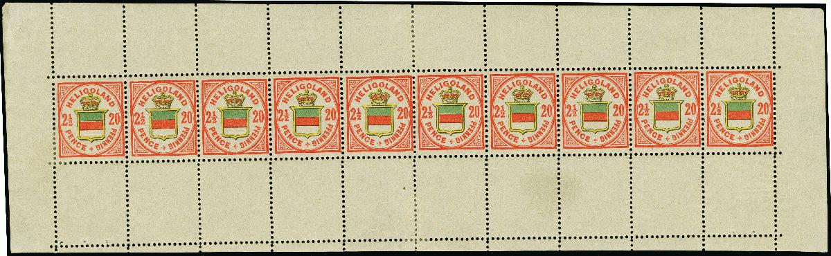 | Zusatzinformationen und Suchstichworte: | 383. Auktion Heinrich Köhler Auktionstermin 14.–15. & 18.–23. März 2024 Los 3891 Altdeutschland Helgoland 1876, 20 Pfg. rotorange/gelb/graugrün, kompletter 10er-Bogen mit allen Bogenrändern, vier Werte postfrisch, die anderen sauber ungebraucht, im Rand teils kleine Unzulänglichkeiten die linke, ungebrauchte Marke, winzige dünne Stelle, sonst tadellos. Schon Einzelmarken in postfrischer Erhaltung sind kaum zu finden, als kompletter Bogen eine außergewöhnliche Seltenheit und vermutlich Unikat, sign. Lemberger sowie Fotoattest Müller (2024) Ausruf 6.000,00 EUR |