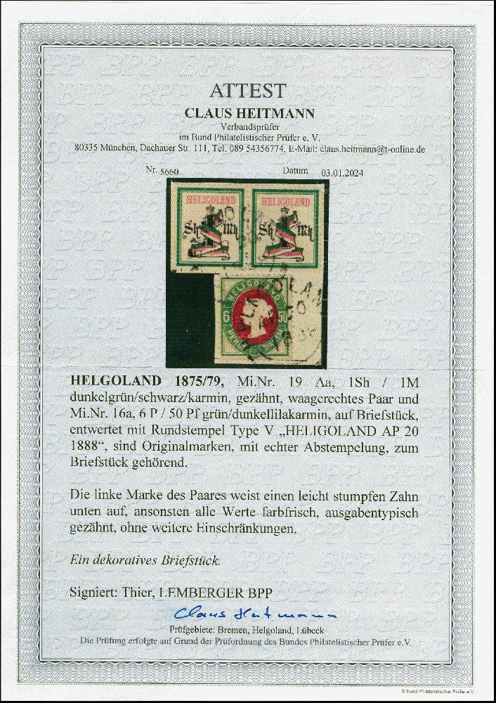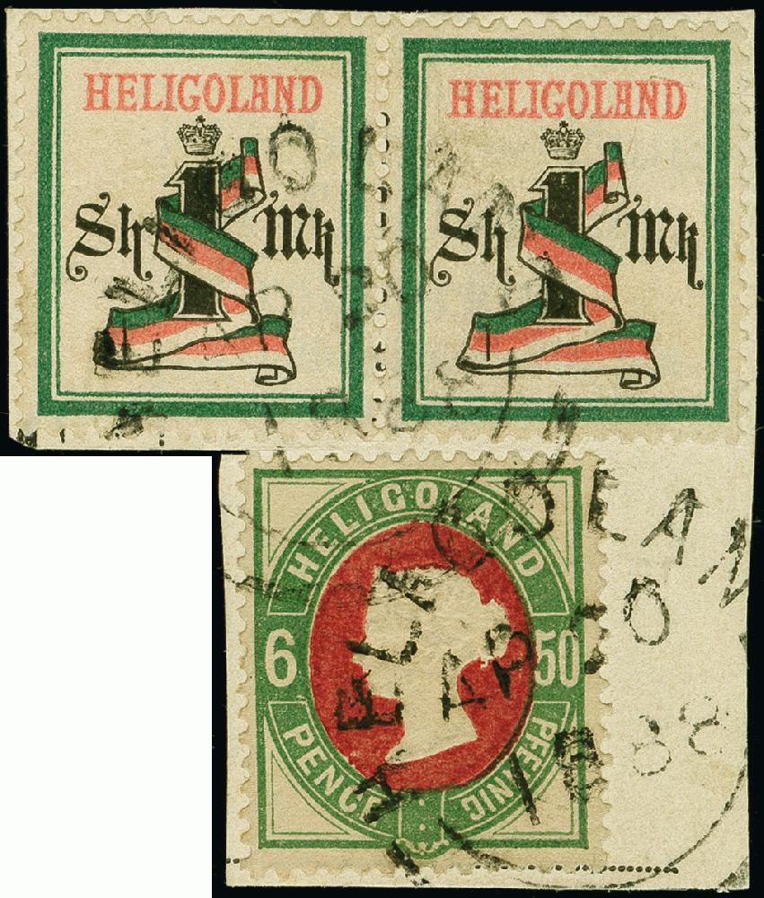 | Zusatzinformationen und Suchstichworte: | 383. Auktion Heinrich Köhler Auktionstermin 14.–15. & 18.–23. März 2024 Los 3892 Altdeutschland Helgoland 1 M. dunkelgrün/schwarz/karmin im waagerechten Paar zusammen mit 50 Pfg. grün/dunkellilakarmin, je farbfrisch, mit Rundstempeln "HELIGOLAND AP 20 1888" auf Briefstück, linke Marke ein belanglos stumpfer Zahn, insgesamt in sehr schöner Erhaltung, sign. Lemberger BPP sowie Fotoattest Heitmann BPP (2024) Ausruf 150,00 EUR |