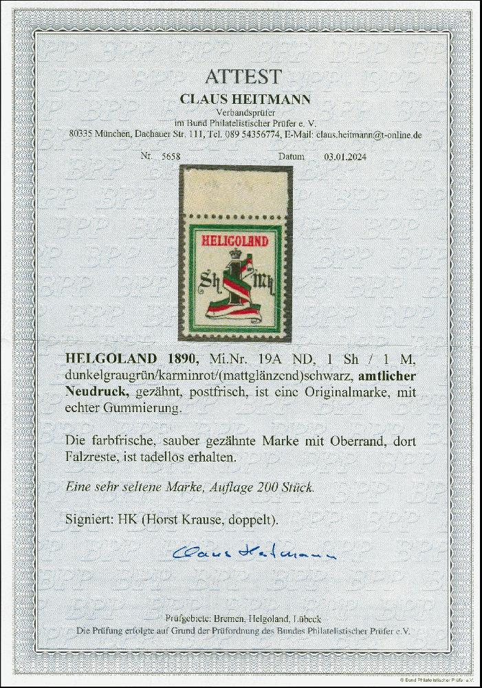 | Zusatzinformationen und Suchstichworte: | 383. Auktion Heinrich Köhler Auktionstermin 14.–15. & 18.–23. März 2024 Los 3897 Altdeutschland Helgoland Amtliche Neudrucke der Reichsdruckerei 1 Mark dunkelgraugrün/karminrot/schwarz mit Oberrand, farbfrisch und gut gezähnt, postfrisch, kleine Falzreste im Oberrand, tadellos, eine seltene Marke, die Auflage betrug lediglich 200 Stück, davon sind 75 Stück in den Handel gelangt, sign. HK sowie Fotoattest Heitmann BPP (2024) Ausruf 800,00 EUR |