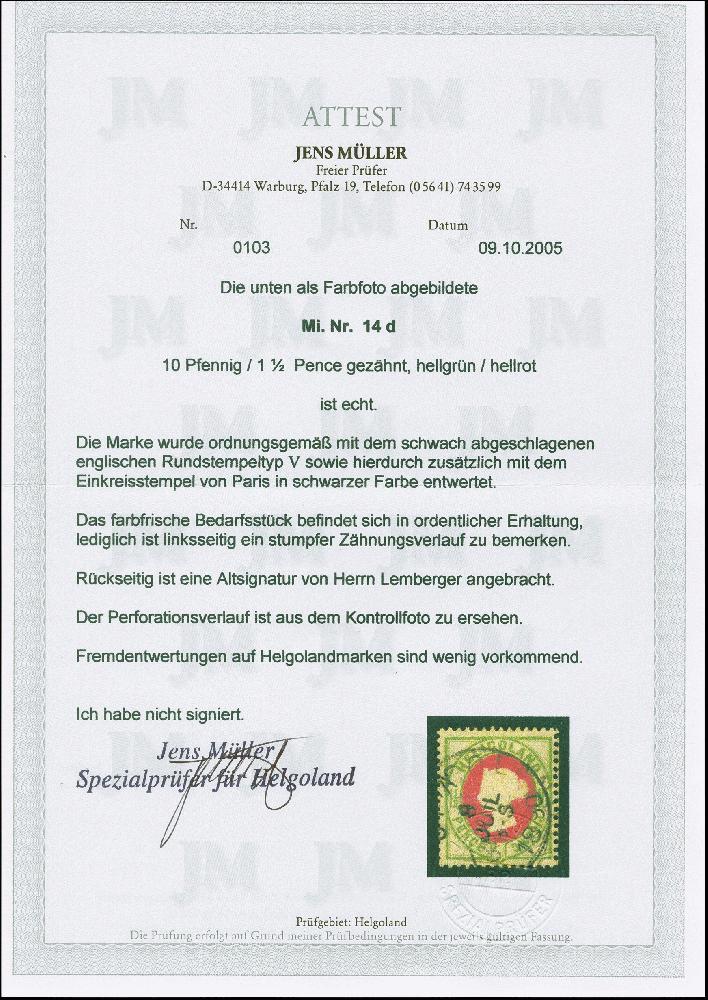 | Zusatzinformationen und Suchstichworte: | 383. Auktion Heinrich Köhler Auktionstermin 14.–15. & 18.–23. März 2024 Los 3900 Altdeutschland Helgoland "SPA 8 JUIL" als zusätzliche Entwertung auf 10 Pfg. hellgrün/hellrot, mit Rundstempel "HELIGOLAND", links einige stumpfe Zähne, sonst in guter Erhaltung, sign. Lemberger sowie Fotoattest Müller (2005) GEBOT |