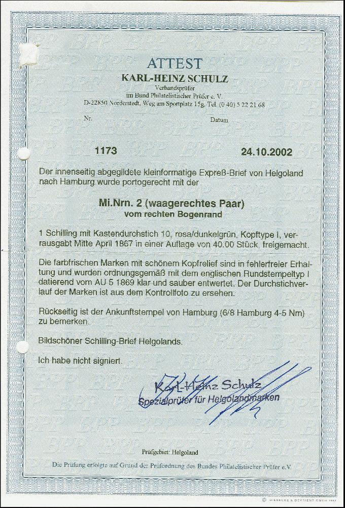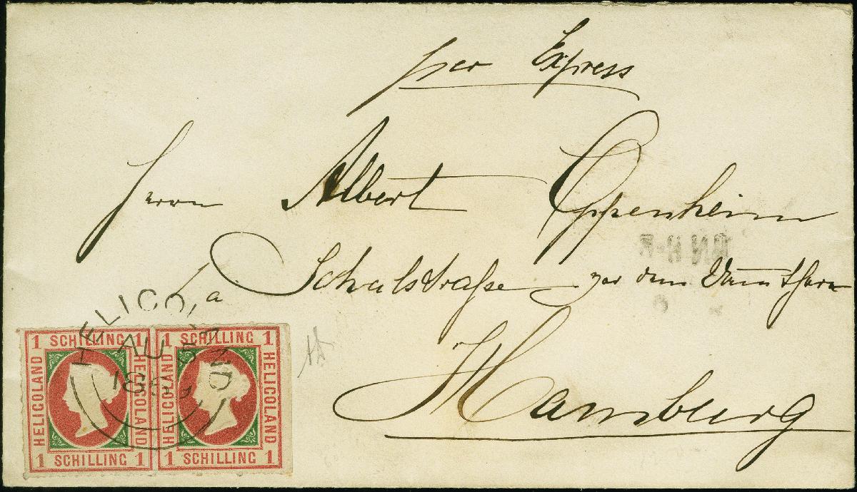 | Zusatzinformationen und Suchstichworte: | 383. Auktion Heinrich Köhler Auktionstermin 14.–15. & 18.–23. März 2024 Los 8631 Altdeutschland Helgoland 1867, 1 Schilling roskarmin/dunkelgrün, waagerechtes Paar mit kurzem rechten Seitenrand, farbfrisch und gut durchstochen mit klarem Rundstempel "HELIGOLAND AU 5 1869" auf weißem Kuvert mit Vermerk "per Express" nach Hamburg, rückseitig mit Maschinenankunftstempel "6/8 HAMBURG 4-5 Nm", eine sehr seltene und wunderschöne Frankatur, sign. Alberto Diena sowie Fotoattest Schulz BPP (2002) Ausruf 2.0000,00 EUR |