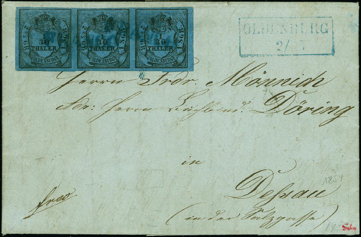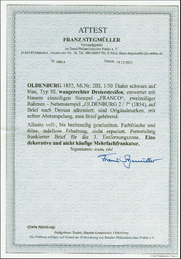 | Zusatzinformationen und Suchstichworte: | 383. Auktion Heinrich Köhler Auktionstermin 14.–15. & 18.–23. März 2024 Los 3914 Altdeutschland Oldenburg 1/30 Th. auf blau, Type III, waagerechter 3er-Streifen, voll- bis breitrandig, mit blauem "FRANCO" und nebengesetztem Ra2 "OLDENBURG 2/7" (1854) auf komplettem Faltbrief nach Dessau. Eine attraktive und seltene Streifen-Frankatur in einwandfreier Erhaltung. Signiert Drahn und Ebel, Fotoattest Stegmüller BPP (2023) Ausruf 500,00 EUR |