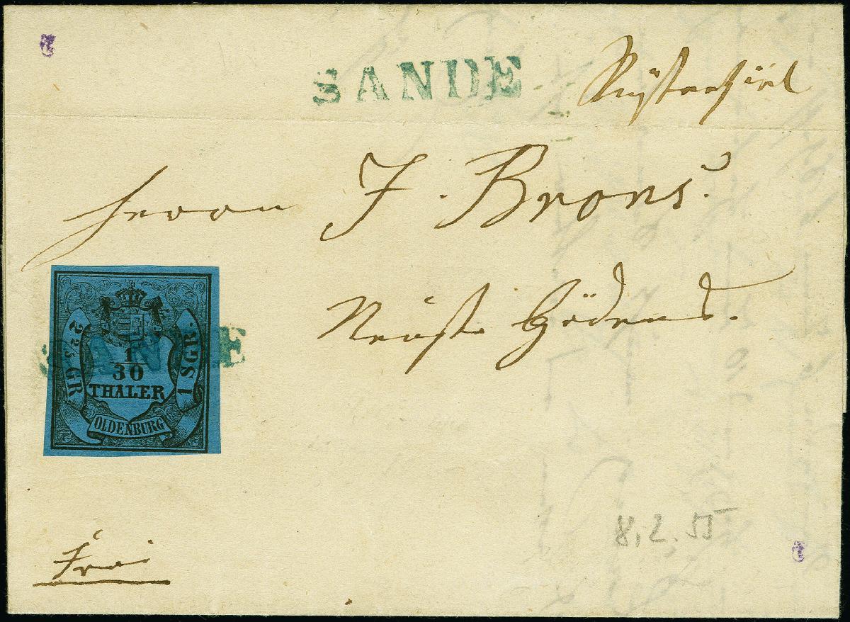 | Zusatzinformationen und Suchstichworte: | 383. Auktion Heinrich Köhler Auktionstermin 14.–15. & 18.–23. März 2024 Los 3915 Altdeutschland Oldenburg 1/30 Th. auf blau, Type III, voll- bis breitrandig, mit sauber auf- und nebengesetztem L1 "SANDE" auf komplettem kleinen Faltbrief mit handschriftlichem Aufgabevermerk "Rüstersiel" nach Neustadt-Gödens. Einer der wenigen Briefe dieser Postablage bei dem die Marke nicht nur handschriftlich entwertet ist. Fotobefund Berger BPP (2000) Ausruf 150,00 EUR |