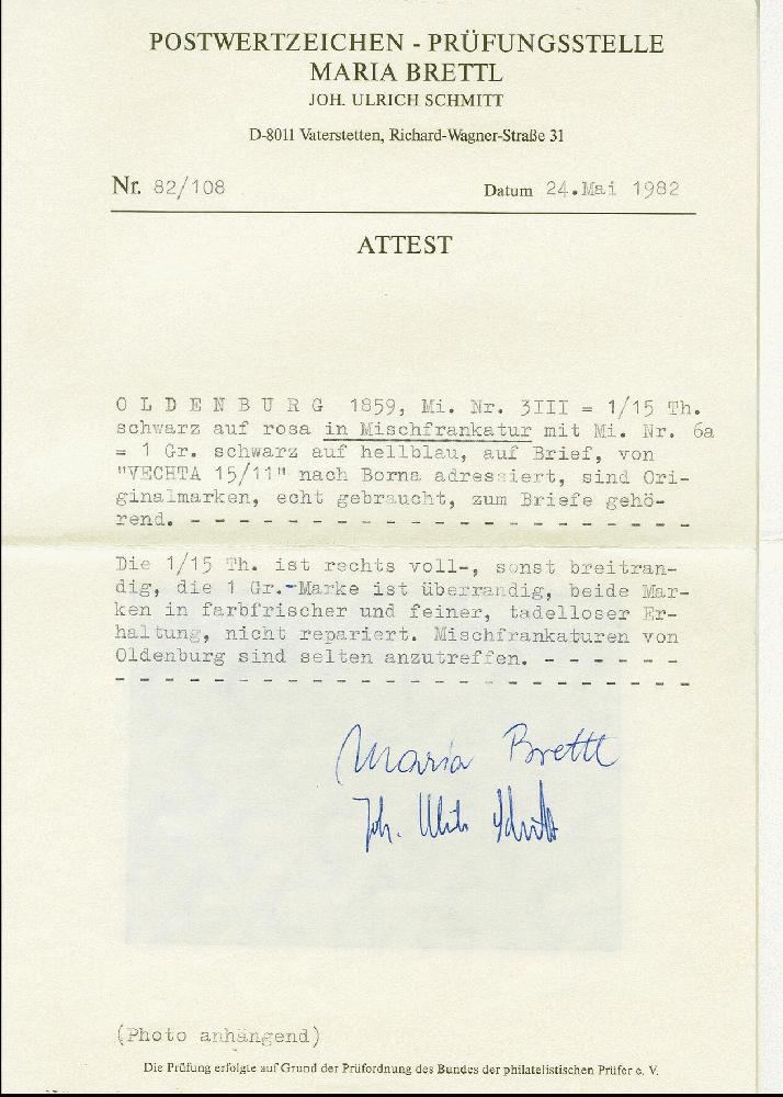 | Zusatzinformationen und Suchstichworte: | 383. Auktion Heinrich Köhler Auktionstermin 14.–15. & 18.–23. März 2024 Los 3918 Altdeutschland Oldenburg 1/15 Thaler schwarz auf rosa, Type III, in Mischfrankatur mit 1859, 1 Groschen schwarz auf blau, beide farbfrisch und voll- bis sehr breitrandig, mit sauber auf- und nebengesetztem Rahmenstempel "VECHTA 15/11" auf Briefhülle nach Borna in Sachsen. Sehr schöne, ursprüngliche und tadellose Erhaltung. Fotoatteste Brettl/Schmitt (1982) und Stegmüller BPP (2023) Ausruf 2.000,00 EUR |
