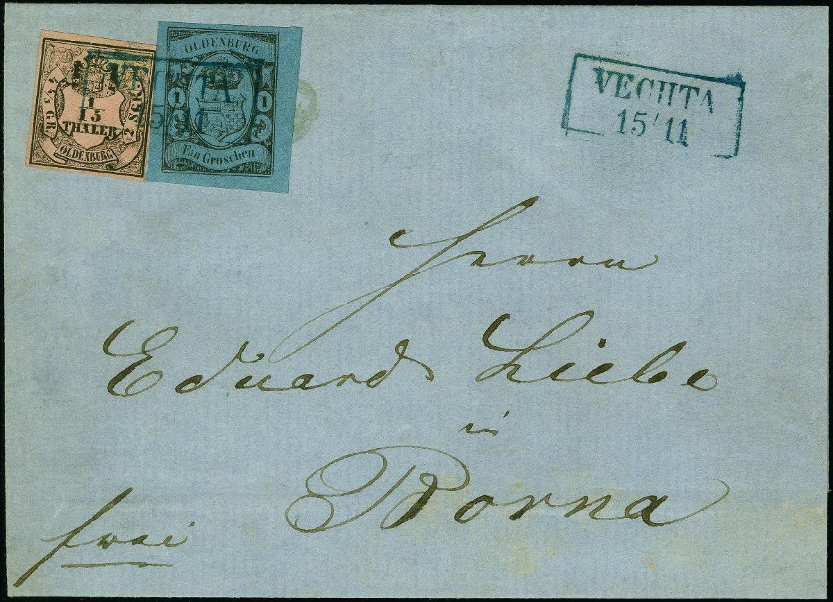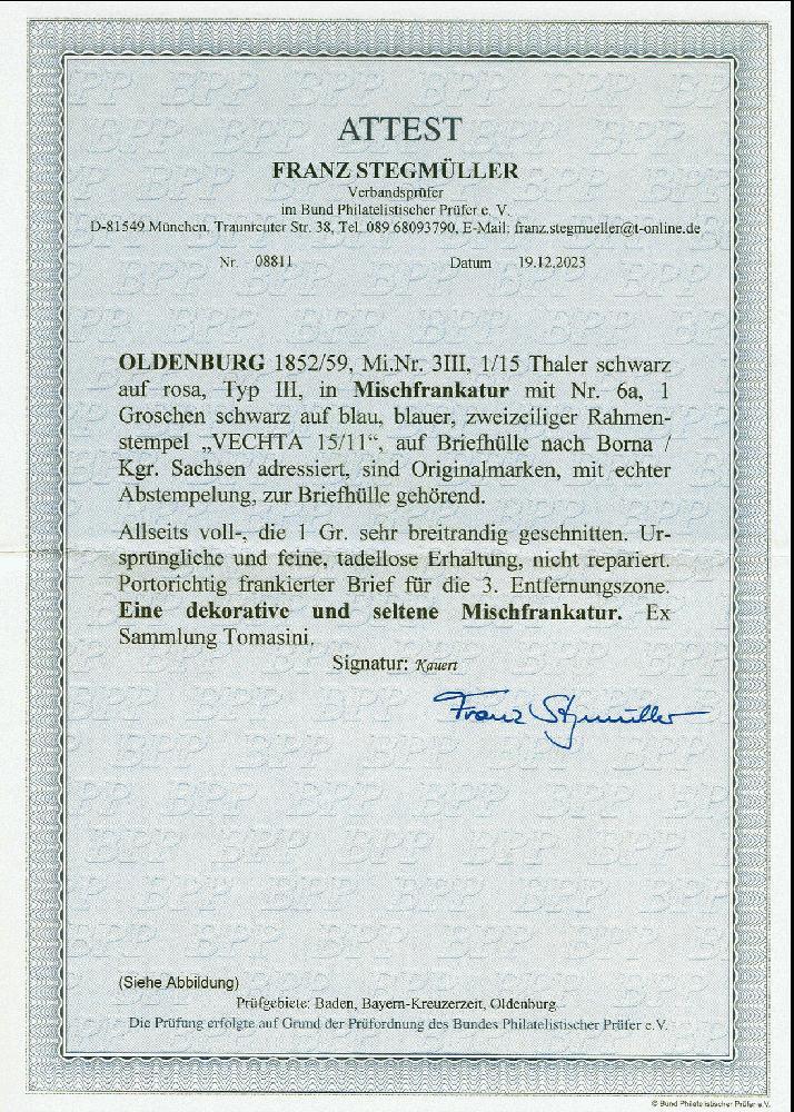 | Zusatzinformationen und Suchstichworte: | 383. Auktion Heinrich Köhler Auktionstermin 14.–15. & 18.–23. März 2024 Los 3918 Altdeutschland Oldenburg 1/15 Thaler schwarz auf rosa, Type III, in Mischfrankatur mit 1859, 1 Groschen schwarz auf blau, beide farbfrisch und voll- bis sehr breitrandig, mit sauber auf- und nebengesetztem Rahmenstempel "VECHTA 15/11" auf Briefhülle nach Borna in Sachsen. Sehr schöne, ursprüngliche und tadellose Erhaltung. Fotoatteste Brettl/Schmitt (1982) und Stegmüller BPP (2023) Ausruf 2.000,00 EUR |