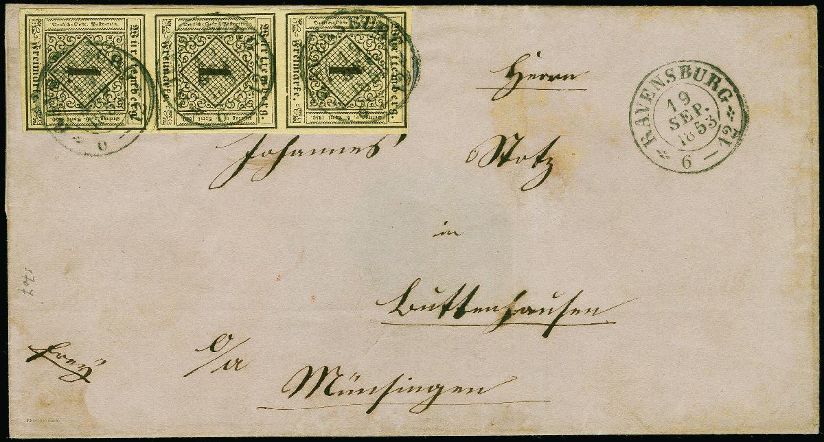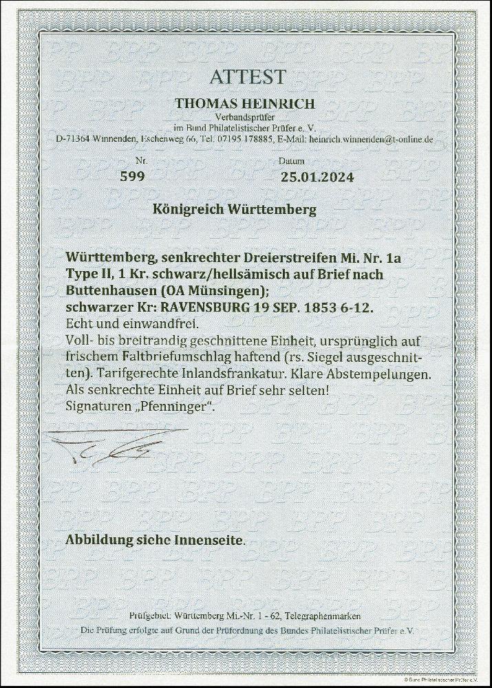 | Zusatzinformationen und Suchstichworte: | 383. Auktion Heinrich Köhler 14.–15. & 18.–23. März 2024 Los 4106 Altdeutschland Württemberg 1 Kr. auf hellsämisch, senkrechter 3er-Streifen, farbfrisch und voll- bis breitrandig, mit sauber auf- und nebengesetztem DKr. "RAVENSBURG 19 SEP. 1853" auf Briefhülle nach Buttenhausen. Sehr schöne und einwandfreie Erhaltung. Signiert Pfenninger und Fotoattest Heinrich BPP (2024) Ausruf 500,00 EUR |