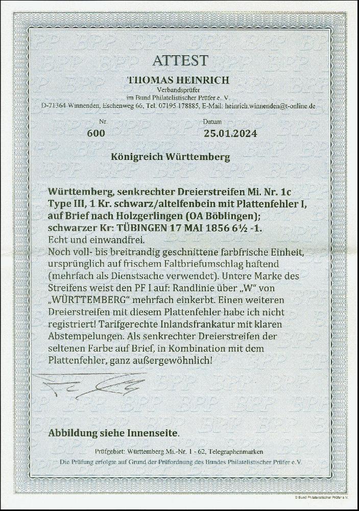 | Prüfer: | Heinrich, Thomas (BPP (Bund Philatelistischer Prüfer)) |