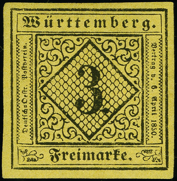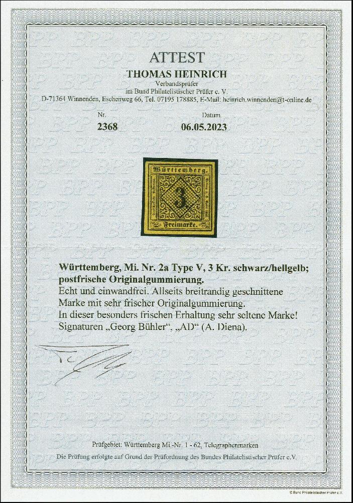 | Zusatzinformationen und Suchstichworte: | 383. Auktion Heinrich Köhler 14.–15. & 18.–23. März 2024 Los 4109 Altdeutschland Württemberg 3 Kr. auf hellgelb, farbfrisch und allseits breitrandig geschnitten, postfrisch, tadellos, in dieser Erhaltung eine sehr seltene Marke, u.a. sign. Bühler sowie Fotoattest Heinrich BPP (2023) Ausruf 100,00 EUR |