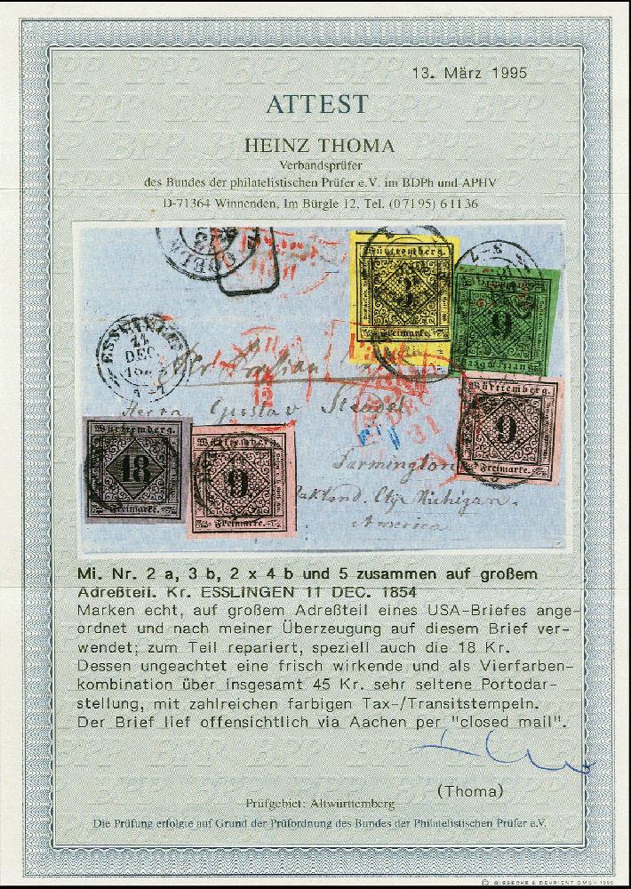 | Zusatzinformationen und Suchstichworte: | 383. Auktion Heinrich Köhler 14.–15. & 18.–23. März 2024 Los 4111 Altdeutschland Württemberg 1851, 3 Kr. schwarz/gelb, Type V, in Mischfrankatur mit 6 Kr. mit schwarz/grünem Seidenpapier, 9 Kr. (2) schwarz/lebhaftrosa und 18 Kr. schwarz/bläulichviolett, Type I, mit DKr. "ESSLINGEN 11 DEC. 1854" auf rückseitig nicht kompletter Briefhülle über 45 Kr. via Prussian-closed-mail nach Farmington, Amerika, mit allen Transitstempeln, portogerecht (6 Kr. Vereinstaxe und 39 Kr. Weiterfranko), die Marken wurden gelöst und teils repariert, sonst tadellos, eine außergewöhnlich seltene und attraktive Vierfarbenfrankatur mit 45 Kreuzer-Porto in die USA; kein weiteres Stück der 1851-Ausgabe registriert, Fotoattest Heinrich BPP (2023) Ausruf 400,00 EUR |