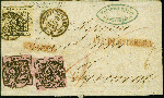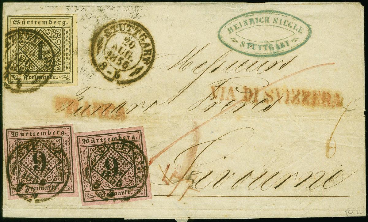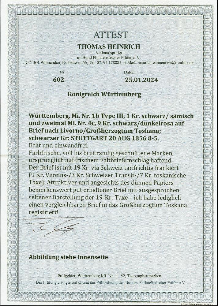 | Zusatzinformationen und Suchstichworte: | 383. Auktion Heinrich Köhler 14.–15. & 18.–23. März 2024 Los 4116 Altdeutschland Württemberg 9 Kr. auf dunkel rosa, 2 Einzelwerte, zusammen mit 1 Kr. auf sämisch, alle farbfrisch und voll- bis breitrandig, mit blauem DKr. "STUTTGART 20 AUG 1856" auf Briefhülle über die Schweiz nach Livorno im Großherzogtum Toskana. Ursprüngliche und tadellose Erhaltung. Eine sehr attraktive und in dieser Form nur ein weiteres Mal registrierte Frankatur in das Großherzogtum. Fotoattest Heinrich BPP (2024) Ausruf 800,00 EUR |