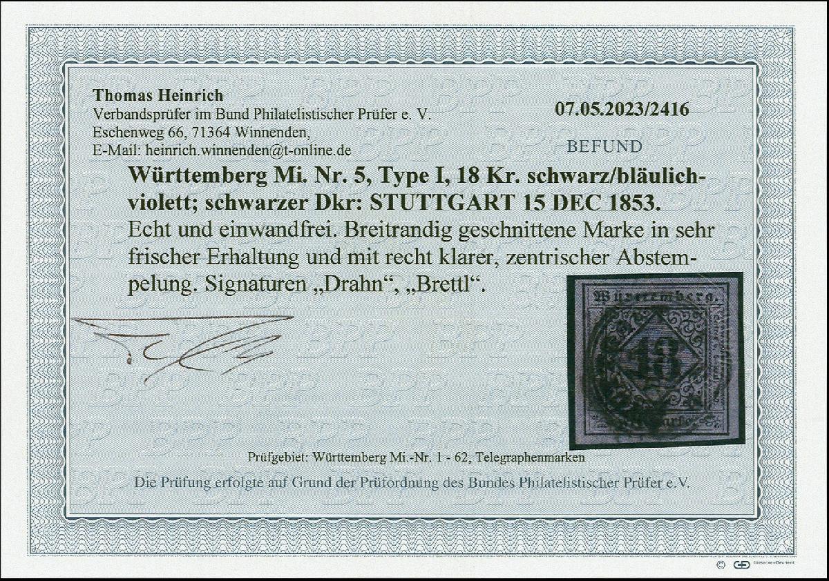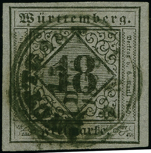 | Zusatzinformationen und Suchstichworte: | 383. Auktion Heinrich Köhler 14.–15. & 18.–23. März 2024 Los 4118 Altdeutschland Württemberg 18 Kr. auf bläulichviolett, farbfrisch und allseits breitrandig geschnitten, sauber mit schwarzem DKr. "STUTTGART 15 DEC 1853" entwertet, tadellos, sign. Drahn und Brettl sowie Befund Heinrich BPP (2023) Ausruf 180,00 EUR |