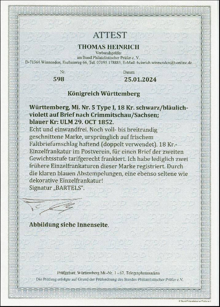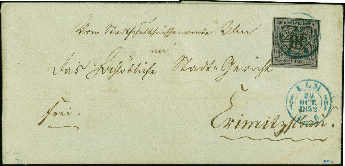 | Zusatzinformationen und Suchstichworte: | 383. Auktion Heinrich Köhler 14.–15. & 18.–23. März 2024 Los 4119 Altdeutschland Württemberg 18 Kr. auf bläulichviolett, noch voll- bis breitrandig und farbfrisch, mit sauber auf- und nebengesetztem blauen DKr. "ULM 29 OCT. 1852" auf Briefhülle der 2. Gewichtsstufe nach Crimmitschau in Sachsen. Eine attraktive Einzelfrankatur in einwandfreier Erhaltung. Es sind nur 2 frühere Einzelfrankaturen dieser Marke registriert. Fotoattest Heinrich BPP (2024) Ausruf 800,00 EUR |