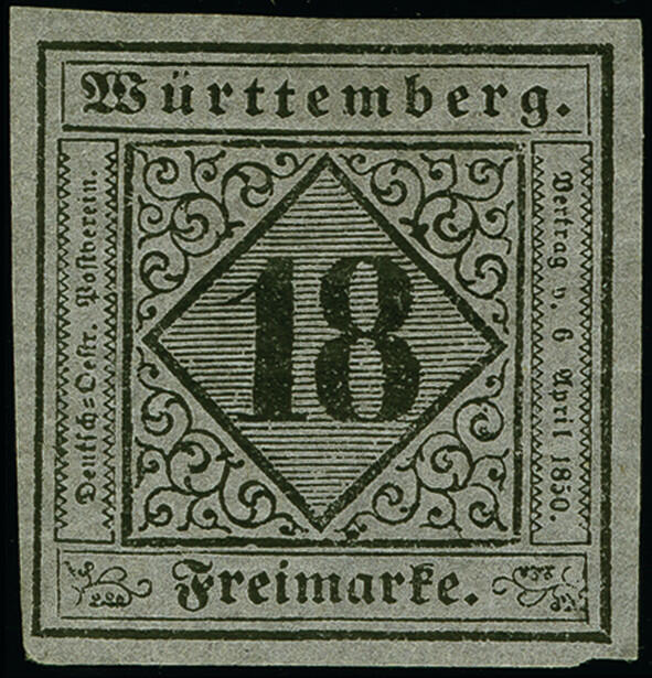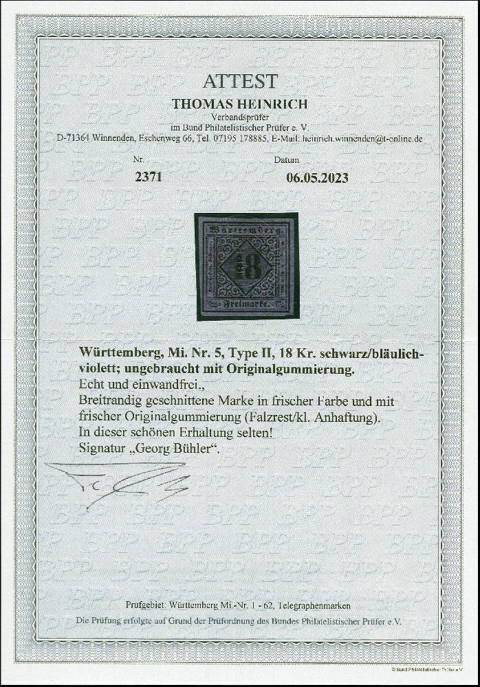 | Zusatzinformationen und Suchstichworte: | 383. Auktion Heinrich Köhler 14.–15. & 18.–23. März 2024 Los 4121 Altdeutschland Württemberg 18 Kr. auf bläulichviolett, farbfrisch und meist breitrandig geschnitten, sauber ungebraucht mit frischer Gummierung, tadellos, sign. Bühler sowie Fotoattest Heinrich BPP (2023) Ausruf 500,00 EUR |