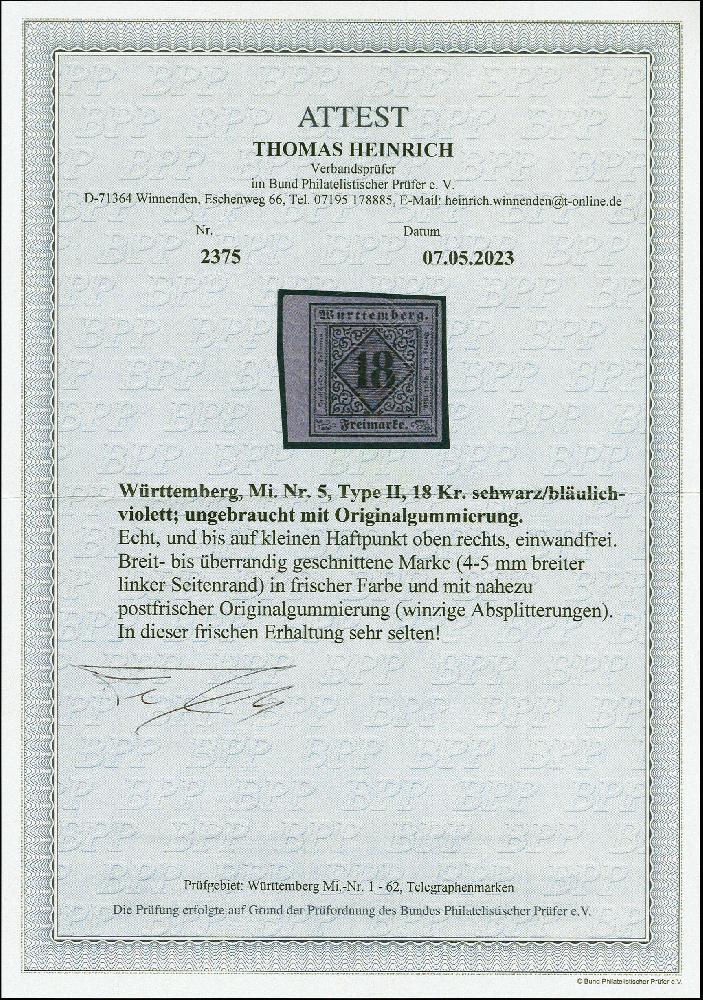| Zusatzinformationen und Suchstichworte: | 383. Auktion Heinrich Köhler 14.–15. & 18.–23. März 2024 Los 4122 Altdeutschland Württemberg 18 Kr. auf bläulichviolett, farbfrisch und breitrandig geschnitten mit 4-5mm Seitenrand links, ungebraucht mit nur winziger Gummiabsplitterung, oben rechts winziger Haftpunkt, sonst tadellos, eine sehr schöne und dieser Erhaltung seltene Marke, unsigniert mit Fotoattest Heinrich BPP (2023) Ausruf 400,00 EUR |
